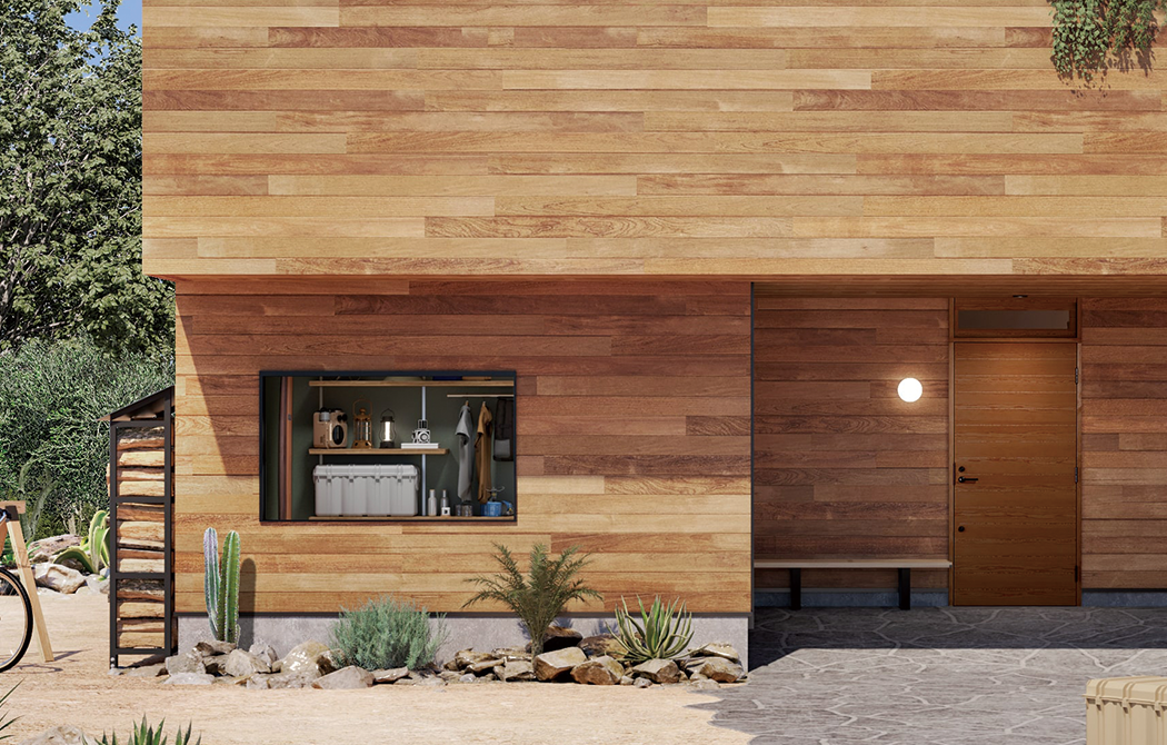 凹凸があるボックスのフォルムが特徴の外観デザイン。自然に溶け込む天然木の外壁を採用し、経年変化を楽しみたい。