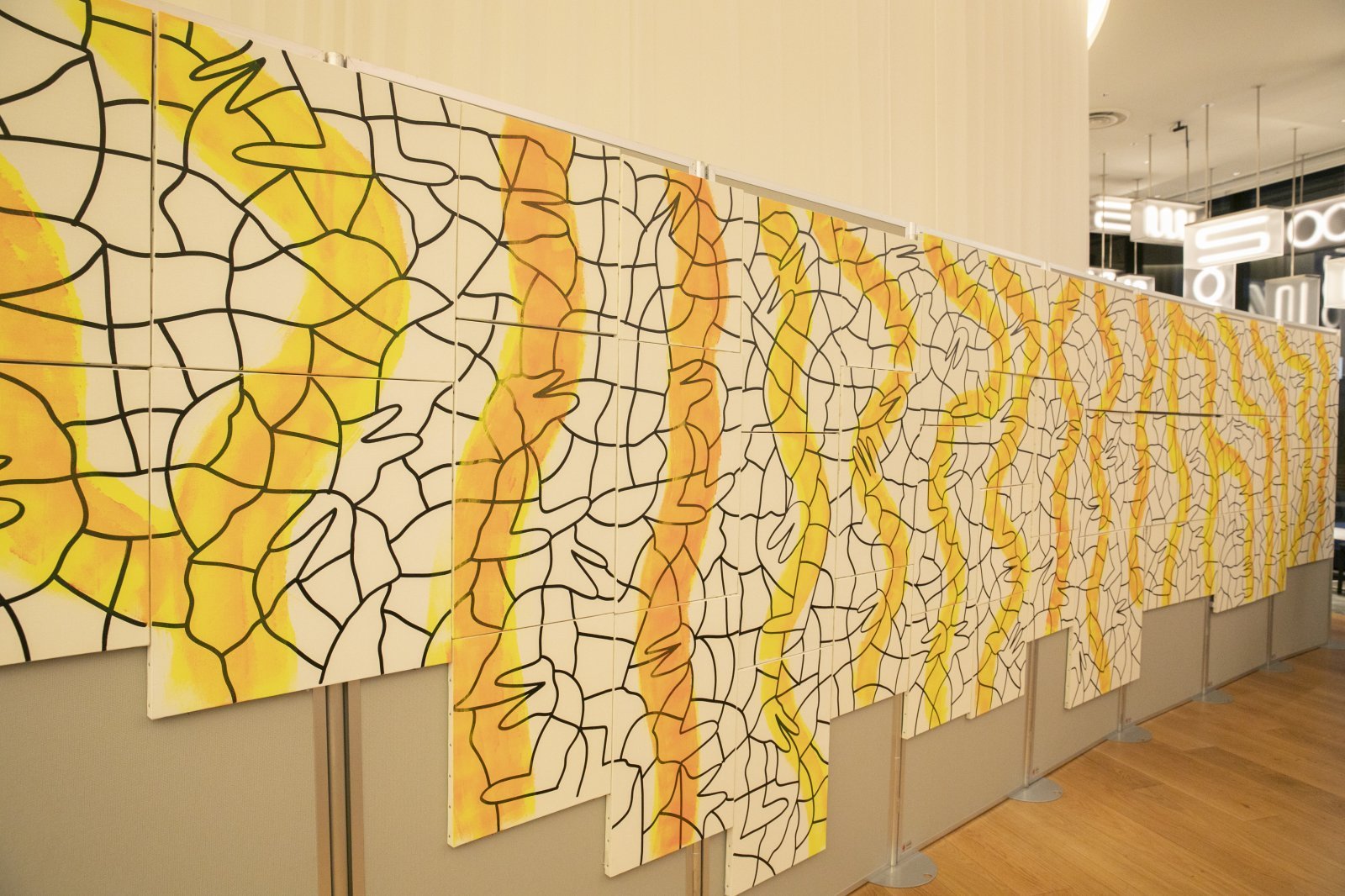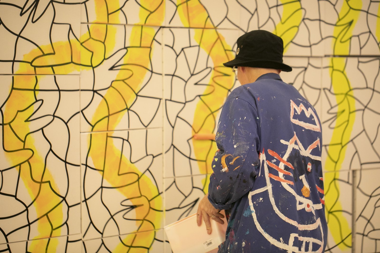 DJブースから心地よいサウンドが流れる中ライブペインティングが始まると、1〜40までの数字が裏にナンバリングされた40枚のキャンバスをつなぎ合わせた大きな白地にスラスラと描いていく。