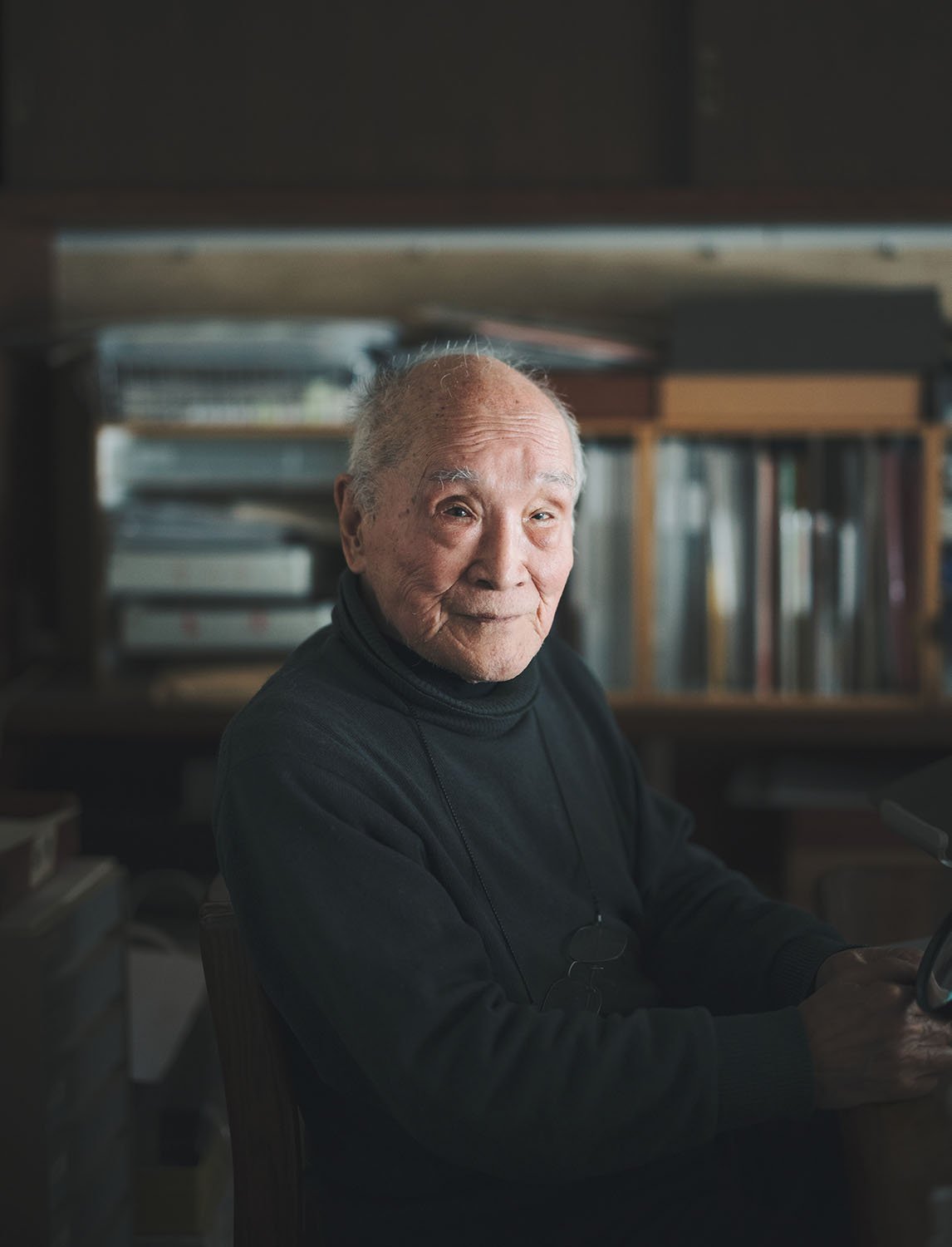 肌に馴染むTシャツやセーターを着こなす姿はいつだって自然体。ことばのこと、時代のこと、幼い頃の戦争体験に至るまでゆっくりとていねいに話す。紳士的な佇まいは昔もいまも変わらない。