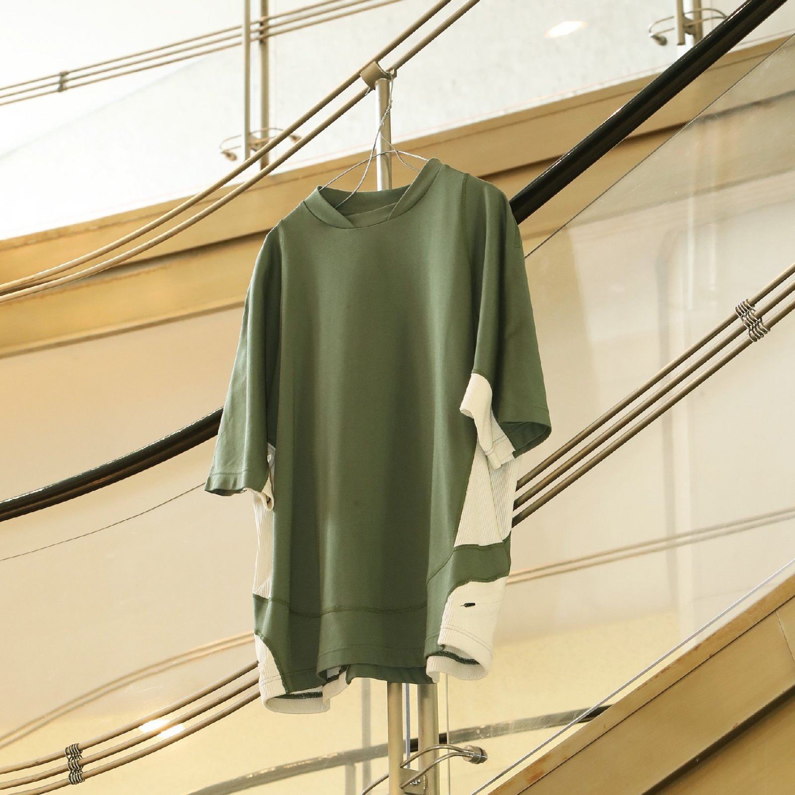 表にコットンとポリエステルの混合素材を、裏にクールマックスを採用し、ハイブリッドな素材づかいでなめらかな肌触りと吸水速乾性を実現。脇下と裾のワッフル生地の切り替えで運動性も高められている。