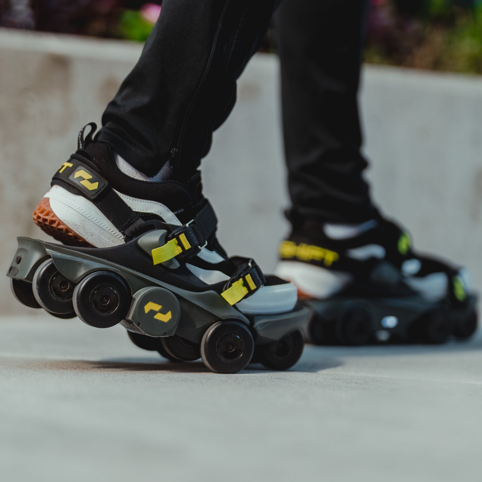 「ムーンウォーカーズ」は、ローラースケートのように靴底に取り付けると電動モーターの力で歩行速度が時速7㎞、通常の2.5倍になる画期的なモビリティデバイス。8個の車輪による安定性は抜群で、耐水性も水溜りや歩道の段差で実証実験済み。USB-Cでフル充電すれば歩行可能距離は8~11㎞。左右それぞれに内蔵されたAIが連動し、個人の歩行パターンを学習するという。