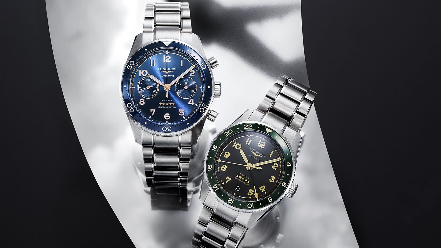 左:「ロンジン スピリット フライバック」/フライバック・クロノグラフ搭載のロンジンの初期モデルの記録は1925年に遡り、36年には世界初の特許を登録。時計や航空機の計器において、名だたる飛行士たちから絶大な信頼を得てきたロンジンの伝統を証明するモデル。最新のシリコン製ヒゲゼンマイを装備し、COSCクロノメーター認証を取得。自動巻き、SSケース&ブレスレット、ケース径42㎜、パワーリザーブ約68時間、シースルーバック、10気圧防水。¥656,700