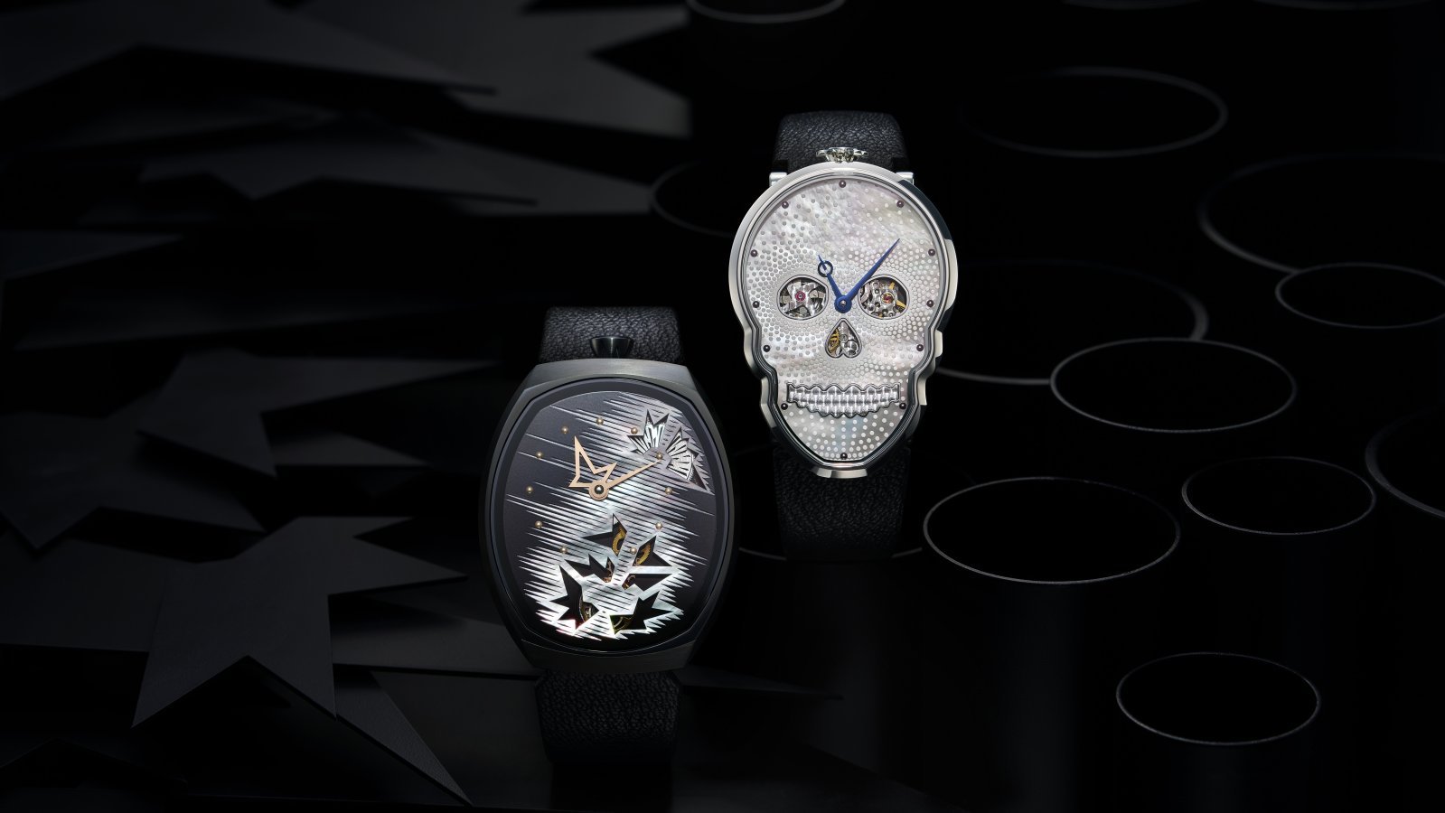 その両者が出合い、誕生したのが「フィオナ・クルーガー : TASAKI 」である。クルーガーのシグネチャーである「SKULL」「CHAOS(カオス)」というふたつのシリーズに、TASAKIによるマザーオプパールのダイヤルを採用した、贅沢かつユニークな時計である。