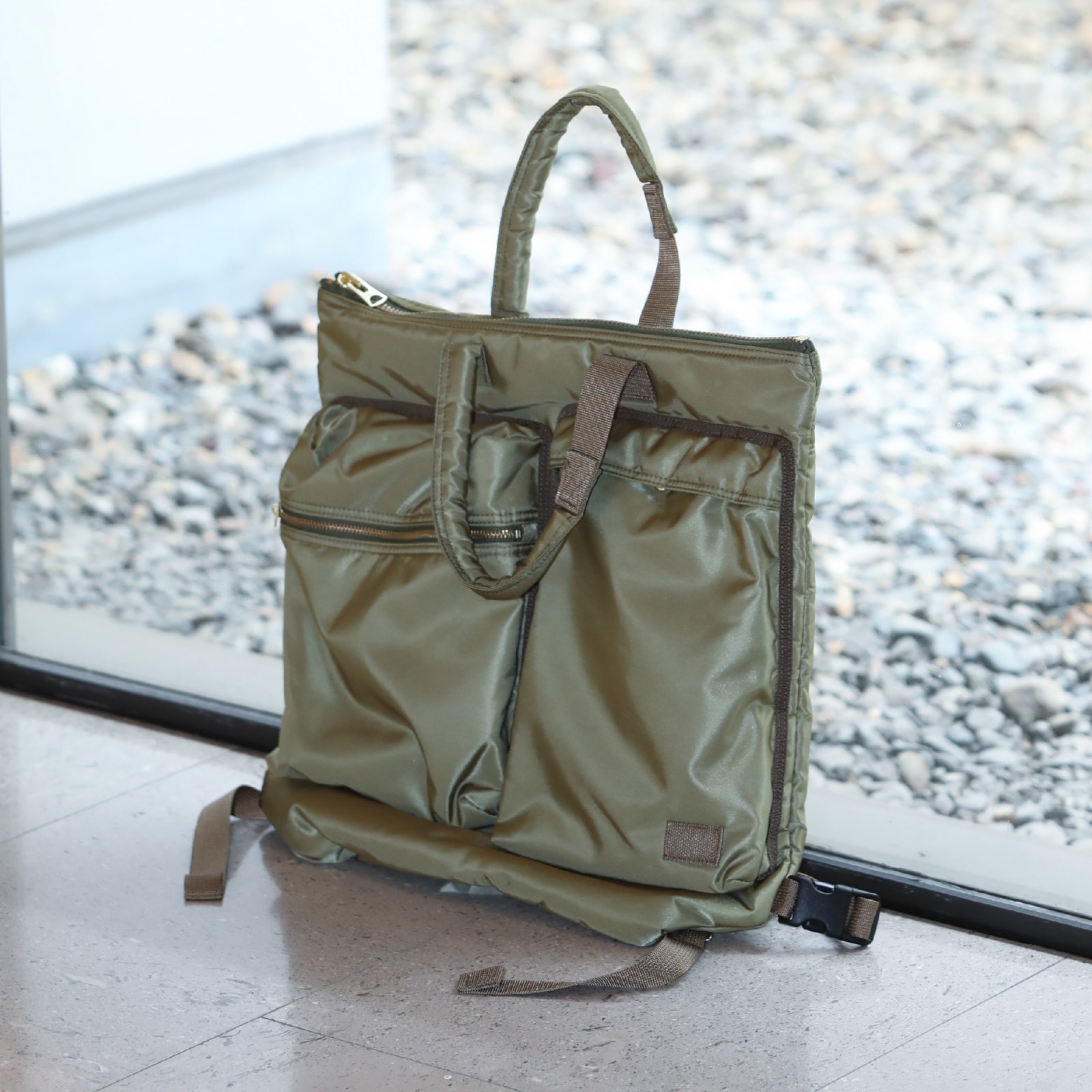 他とひと味違うトートを選ぶならヘルメットバッグがお薦め。ナイロン素材で収納力や機能性に優れ、使い勝手も抜群だ。こちらはポーターの定番をサカイが再構築。立体感あるポケットを配し、色もくすんだカーキに。大きめサイズもうれしい。H45×W40×D2㎝。