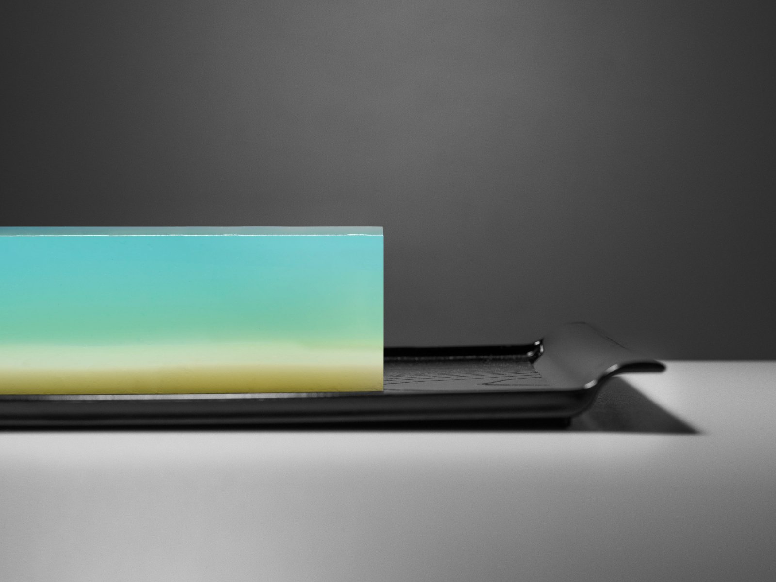 美しいブルーの色合いは欧米で人気のヘルシーフードのひとつ、スピルリナで着色。デリケートな天然素材が故に、色合いと食感を調整するのに苦労したそう。