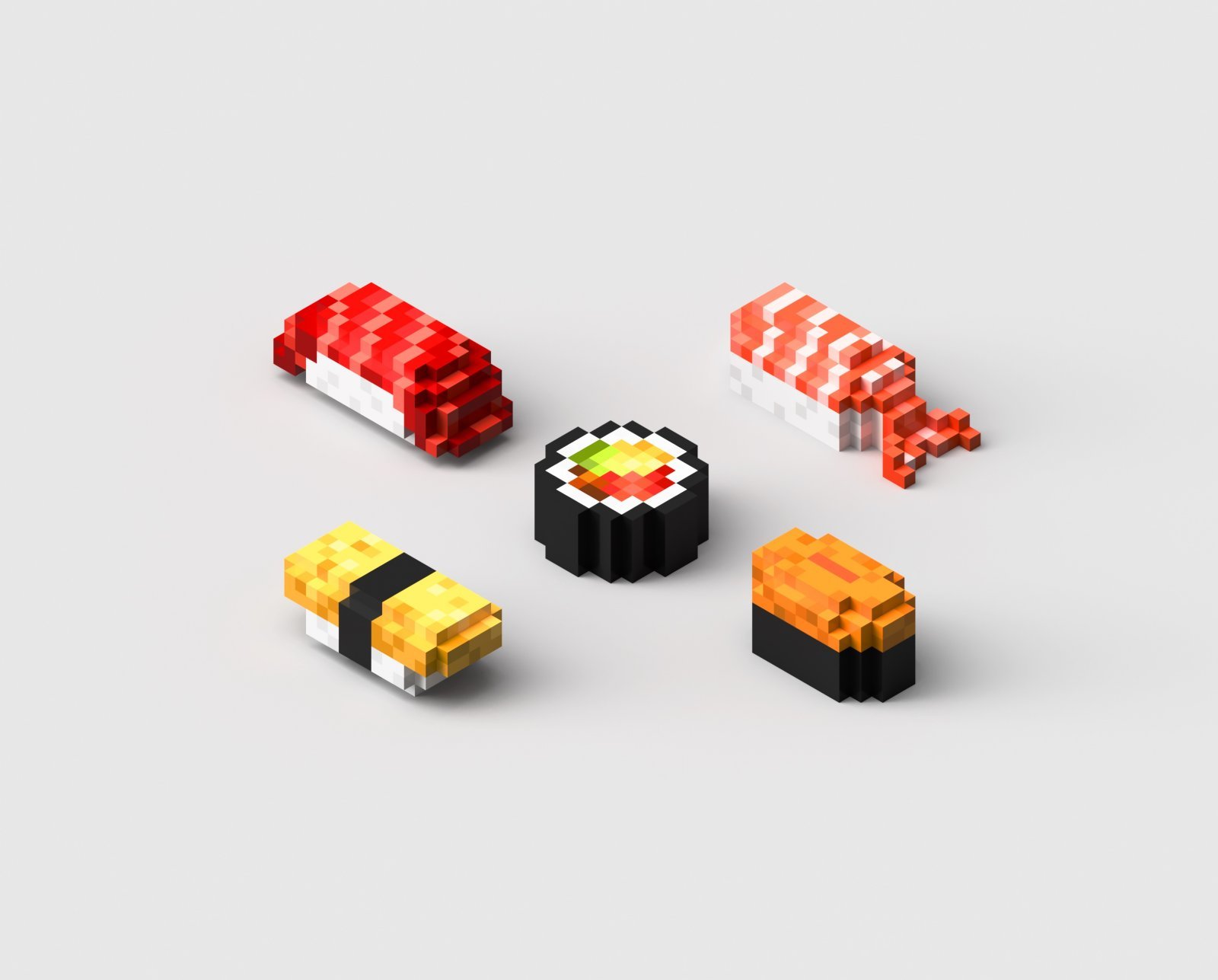 斬新な食の未来を打ち出している「オープンミールズ」のプロジェクト“転送寿司” ではデータ化された寿司が転送され、遠隔地の屋台で3Dプリンターによって生成される。これはビクセル寿司のイメージ。それに続くプロジェクトの“ スシ・シンギュラリティ” では、世界で初めてデジタル上で食をデザインできるオペレーションシステムの開発が進行中。栄養素、味、食感、香りといった寿司の構成要素を分解し、数㎝角の形状の中に再構築するというコンセプトを発表。食のイノベーションを牽引している。