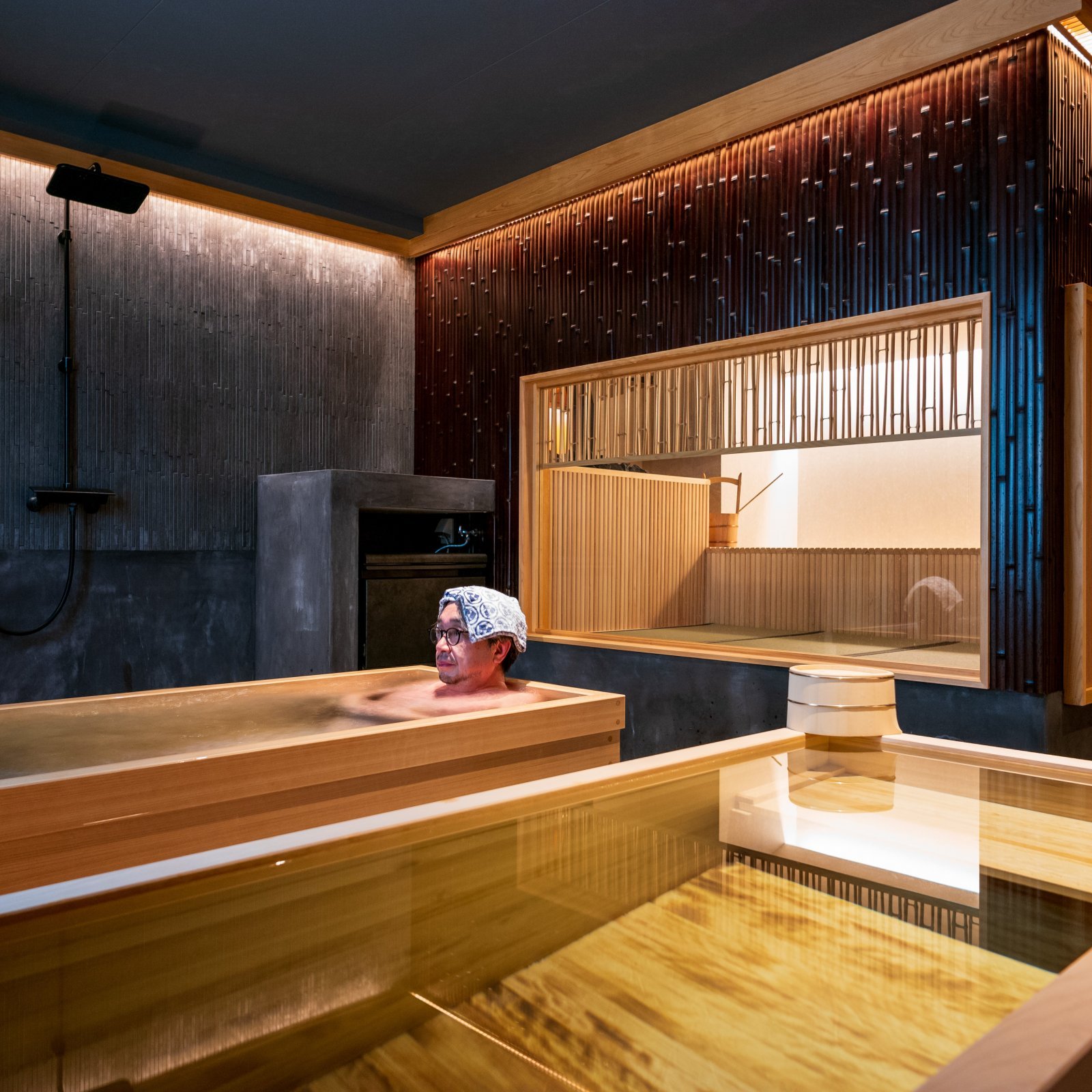 さて、熊本はとにかく水がいい。阿蘇の伏流水を地下から汲み上げたミネラルウォーター。これを存分に堪能するため、茶室風のサウナが設けられた。汗を流し、天然のミネラルウォーターと人工ラジウム泉の交互浴を繰り返す。地元の檜を贅沢に使った和の設えによって心に慎みが生まれ、それがひいては心地よさに変わる。