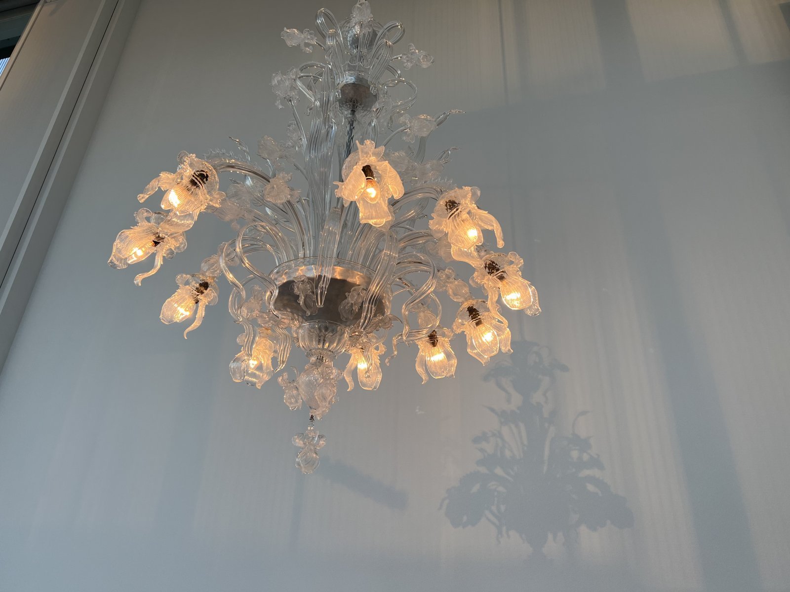 ガラス張りの空間がユニークなエスパス ルイ・ヴィトン東京。自然光の差し込む展示室の表情は時間や天候によって変わっていくが、今回はあえて日没前の鑑賞をおすすめしたい。太陽が傾き、正面のビルに反射した西日が空間を煌々と照らしつつも、次第に光量を失うと、それまで風景に溶けるように灯っていたネオンの明かりが際立ちはじめ、メッセージが強く浮かび上がってくる。そして暗くなって妖しく艶やかに映るシャンデリアの光とともに、『A=F=L=O=A=T』による音も不思議と幽玄な調べへと転化して聞こえ、いつしか異次元へと誘われるような錯覚にとらわれる。そのマジックアワーに起こる神秘的な現象を前にすると、ここが東京であることを忘れ、ケリス・ウィン・エヴァンスの作品世界にぐっと引き込まれていく。