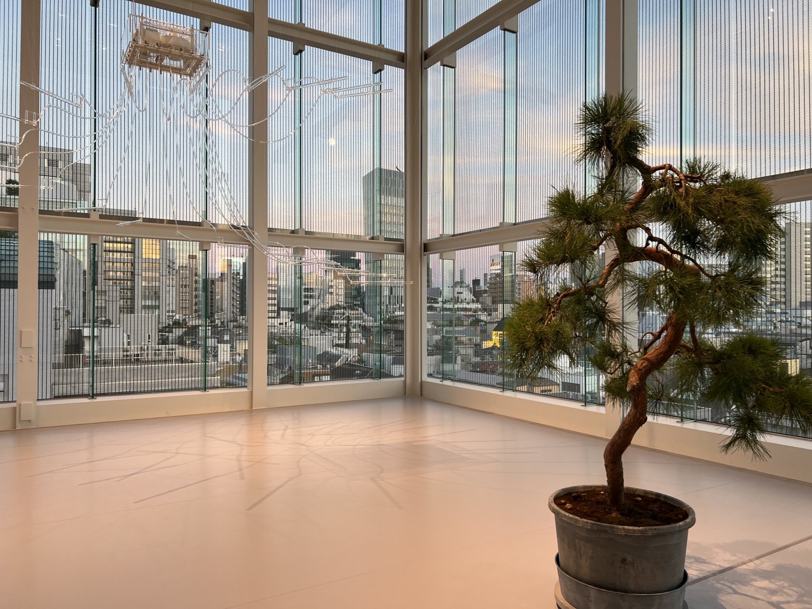 しばらくシャンデリアの瞬きやネオンに見入っていると、会場全体の空気を揺さぶるような音が発せられることに気づく。それが20本のガラス製のフルートが宙に浮く『A=F=L=O=A=T』だ。さまざまな高さで楕円状に吊り下げられたフルートには、長く透明のチューブによりパイプオルガンで使われる送風機がつながっていて、作家の手がけた曲からそれぞれ一音を奏でていく。フルートは沈黙しつつ、にわかに音を発したと思うと、時に幾重にも重なるかのように強く鳴り響き、空間そのものを音で形作るかのようにして満たしていく。このほか、極めてゆっくりと回転するターンテーブルに松の木を置いた作品の動きも見逃さないようにしたい。