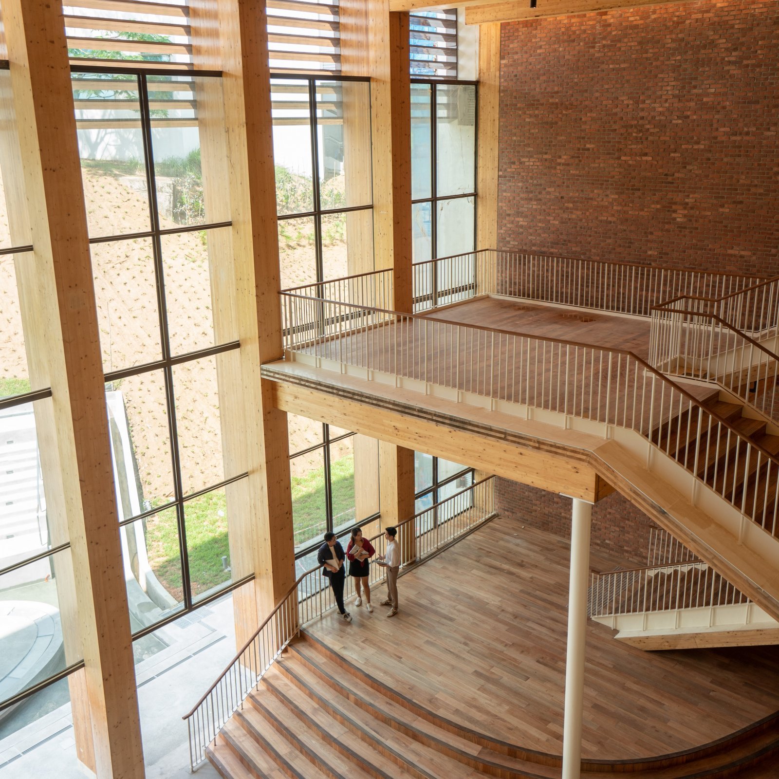 学生と教師の交流のためにデザインされ、地上階はオープンな空間に風が吹き抜け心地がいい。隣には8年前に竣工したトーマス・ヘザウィック設計のユニークな校舎も。建築愛好家の巡礼の地として、ますます賑やかになりそうだ。