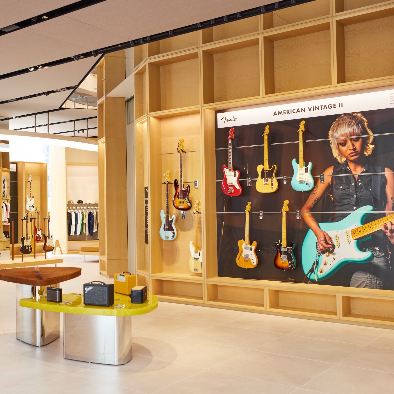 コロナ禍により高まったといわれるギター熱。人気の再燃を後押しした世界的楽器メーカー、フェンダーの旗艦店が東京・原宿に誕生。代官山T-SITEなどを手がけたクライン ダイサム アーキテクツがデザインを担当した地下1階から3階までの広大な空間には、最新のギターやベース、アーティストのシグネチャーモデルなど、各階のテーマに合わせた楽器が並ぶ。大音量でギターとアンプを試せる防音室に、カフェ、アパレルショップも併設。初心者からプロまで、楽器好きはもちろん、訪れた誰もが楽しめる場だ。
