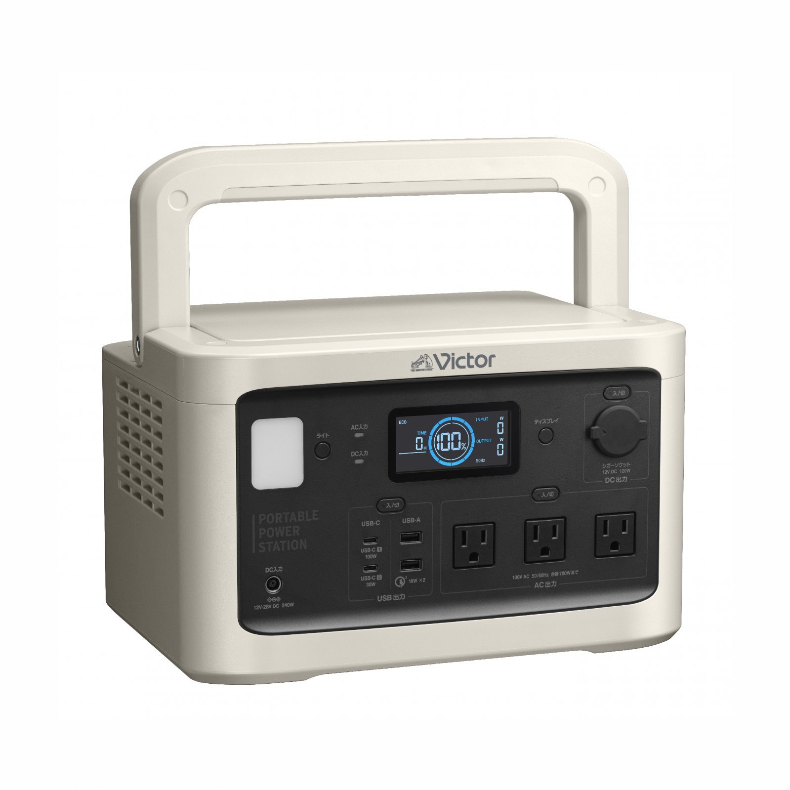 自動で満充電に近い状態を保つので、使いたい時に電池残量を気にしないで気兼ねなく使えるのがいい。AC出力700W(瞬間最大出力1400W)、容量806Whなので、PC、タブレットやスマートフォンなどの充電はもちろん、小型の調理家電や扇風機などにも使える。インテリアに溶け込むライトベージュのカラーと丸みを帯びたデザインで、馴染みのあるビクターのマークにも心躍るというものだ。専用のポータブルソーラーパネルを使えば、電気がない屋外でも太陽光発電ができる。