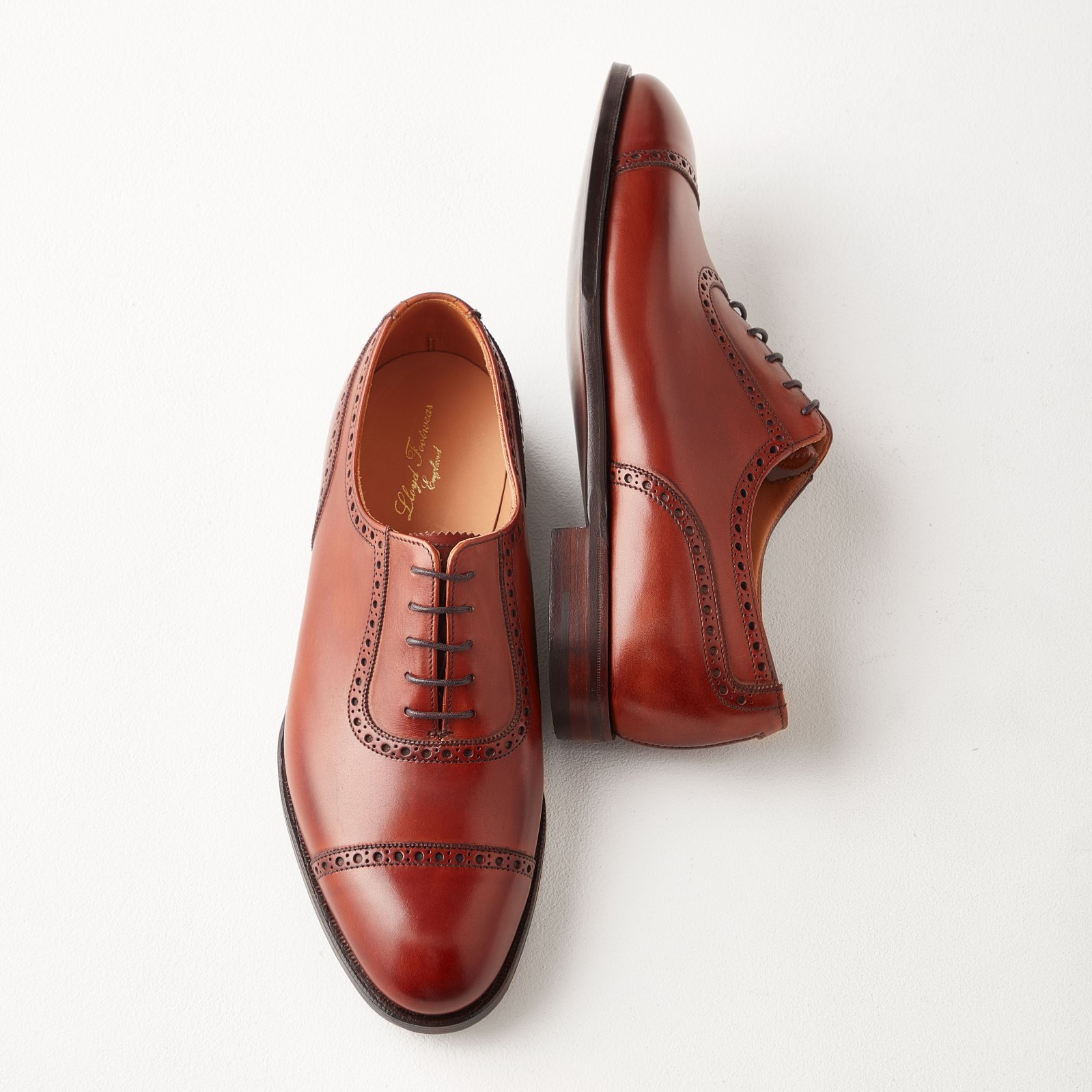 現在、ロイドフットウェアではいくつかのラインが展開されているが、今回紹介するのは、最上級に位置する「マスターロイド」のパンチキャップオックスフォードだ。この「マスターロイド」はノーサンプトンで「マスター」の称号を持つトップランクの職人によってハンドメイドで製作されたコレクションで、既製靴としては例を見ない最高の材料と技術によって、一足一足丁寧に製作されている。この「Surrey」というモデルは、つま先のブローギングが一文字状で、シューレース周りのU字型の装飾も美しい。職人技が感じられる素晴らしい出来栄えのモデルだが、履き心地も最高。フィッティングしたその瞬間に違いが体感できると聞く。その履き心地をぜひ東京と大阪にある店で、英国流のフィッティングを味わいながら堪能して欲しい。
