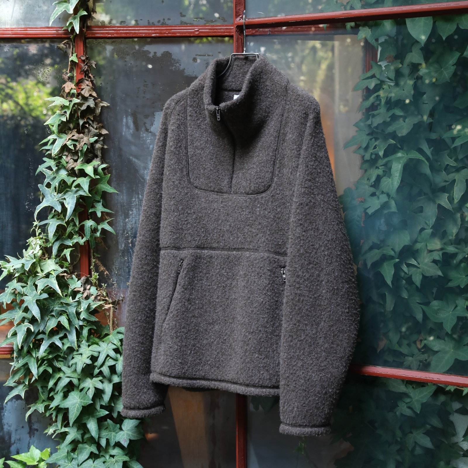フリースというと生地の素材はポリエステルが一般的だが、こちらは100%ウール素材。細かな毛羽立ちのある質感に加え、ウール本来の効能により汚れや匂いもつきにくい。あえて染色せずにそのままの色合いやムラ感を残した。