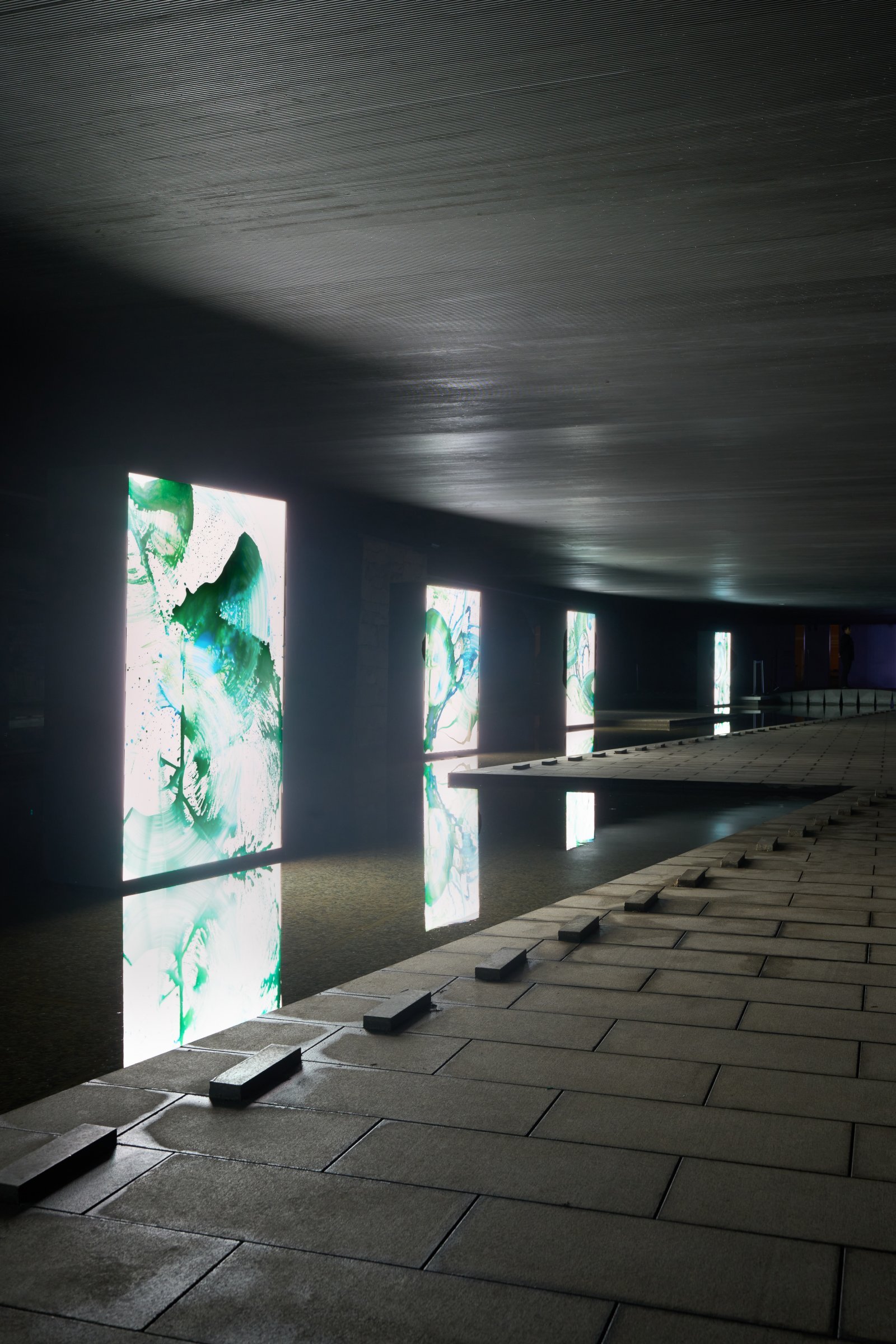 秋の訪れを感じさせる10月初旬、東京都現代美術館を貸し切って行われたこのイベントは、新しい未来を創造させる空間として、ジャンルの垣根を超えて活躍するアーティストやミュージシャン、フードによって構成された。地下1階の「水と石のプロムナード」に展示されたのは、スギヤマタクヤのインスタレーション。暗闇の中に揺らめきながら浮かび上がる水紋のような作品が映像と音で表現され、幻想的な世界へと誘う。