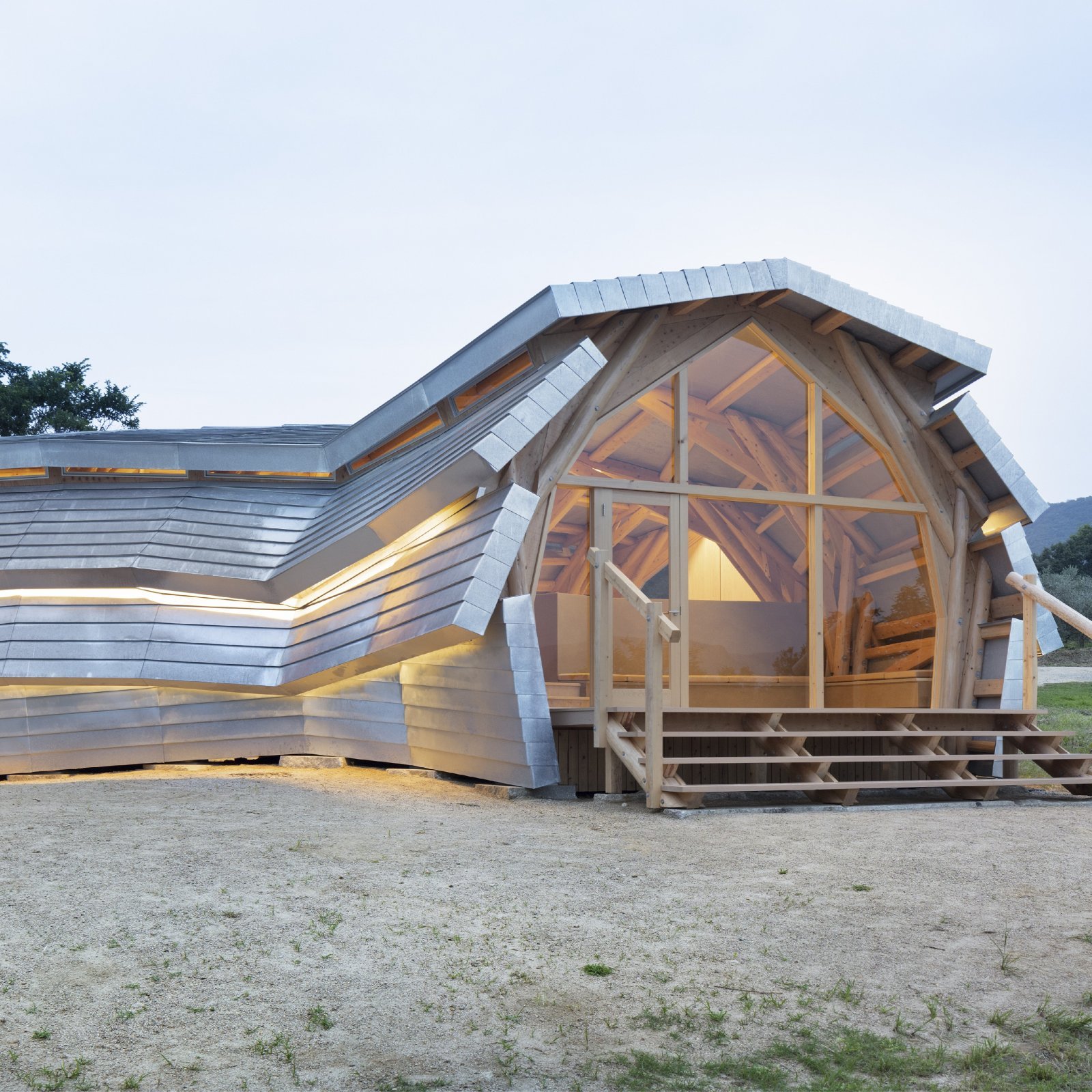 今年7月に開業したゲートラウンジは、大きな丸太が支えるダイナミックな木造建築が目を引く。周辺環境から導き出された多角形の空間が、まさにゲートのように訪れた人と豊かな景色をつなぐ。