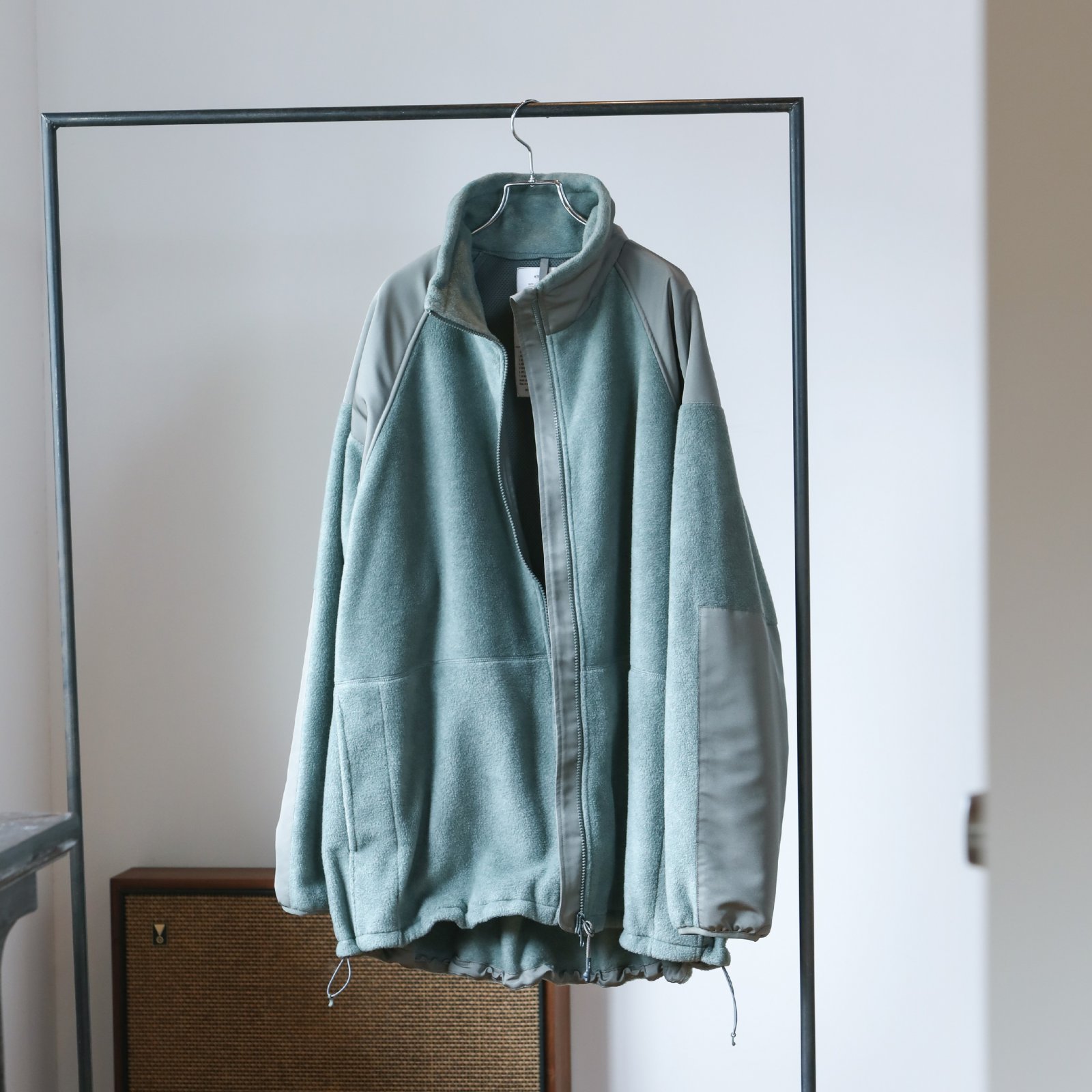 米陸軍が取り入れている寒冷地向けレイヤリングシステム「ECWCS」のフリースジャケットをベースに製作。肉厚ながら落ち感もあるレーヨン混フリースに、細番手の糸を密に織り上げたポリエステルを肩や袖部分にプラス。ミリタリーをモードに昇華している。
