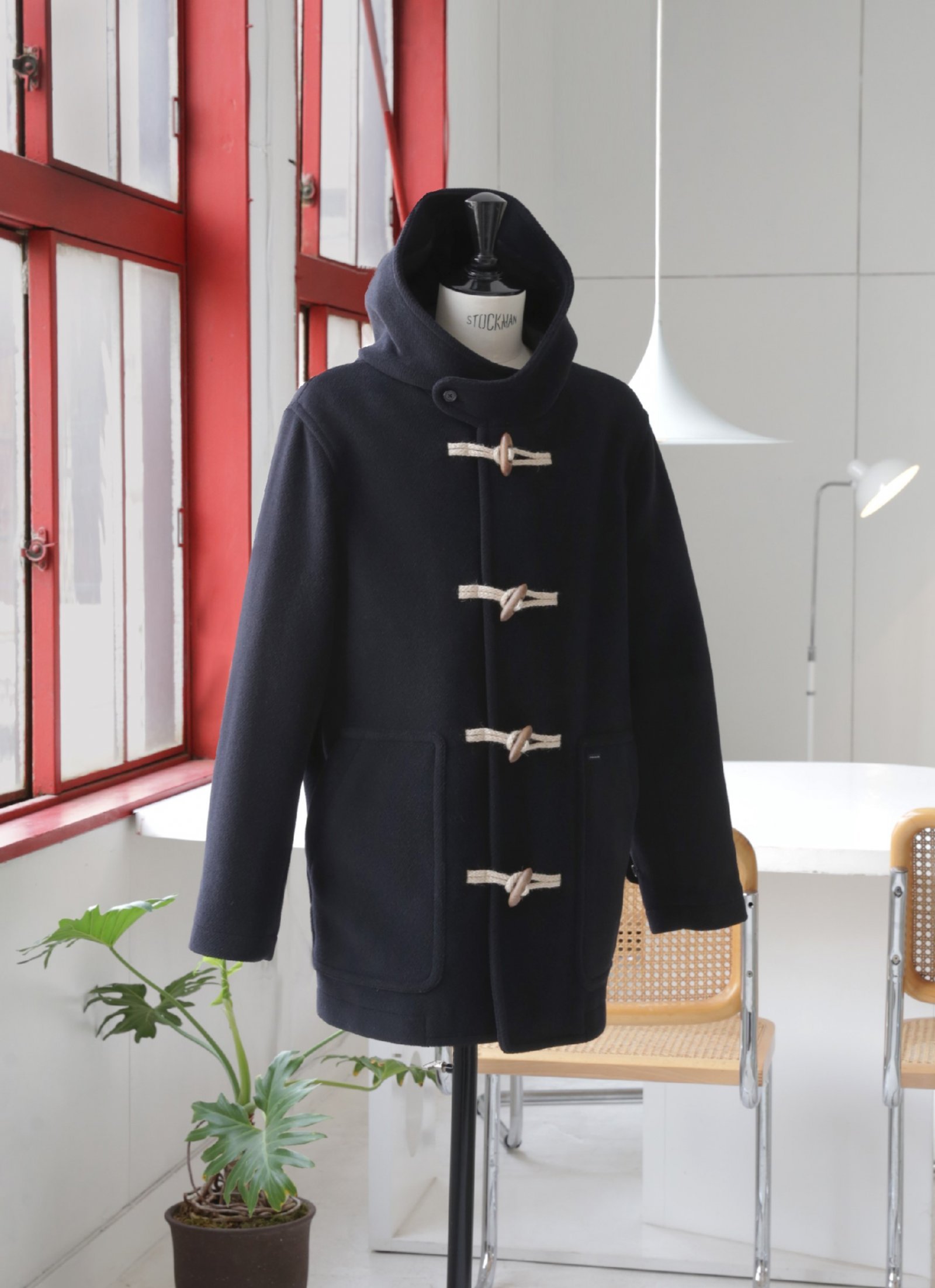 膝上丈のコートは着席時も腰まわりがもたつかず、気軽に着脱できる。そんな短めの着丈にアレンジしつつも、大きなフードや木製トグルなど、ベースとなっているのは王道のダッフルコートだ。グラデーションストライプのヘリンボーンが目を引く。