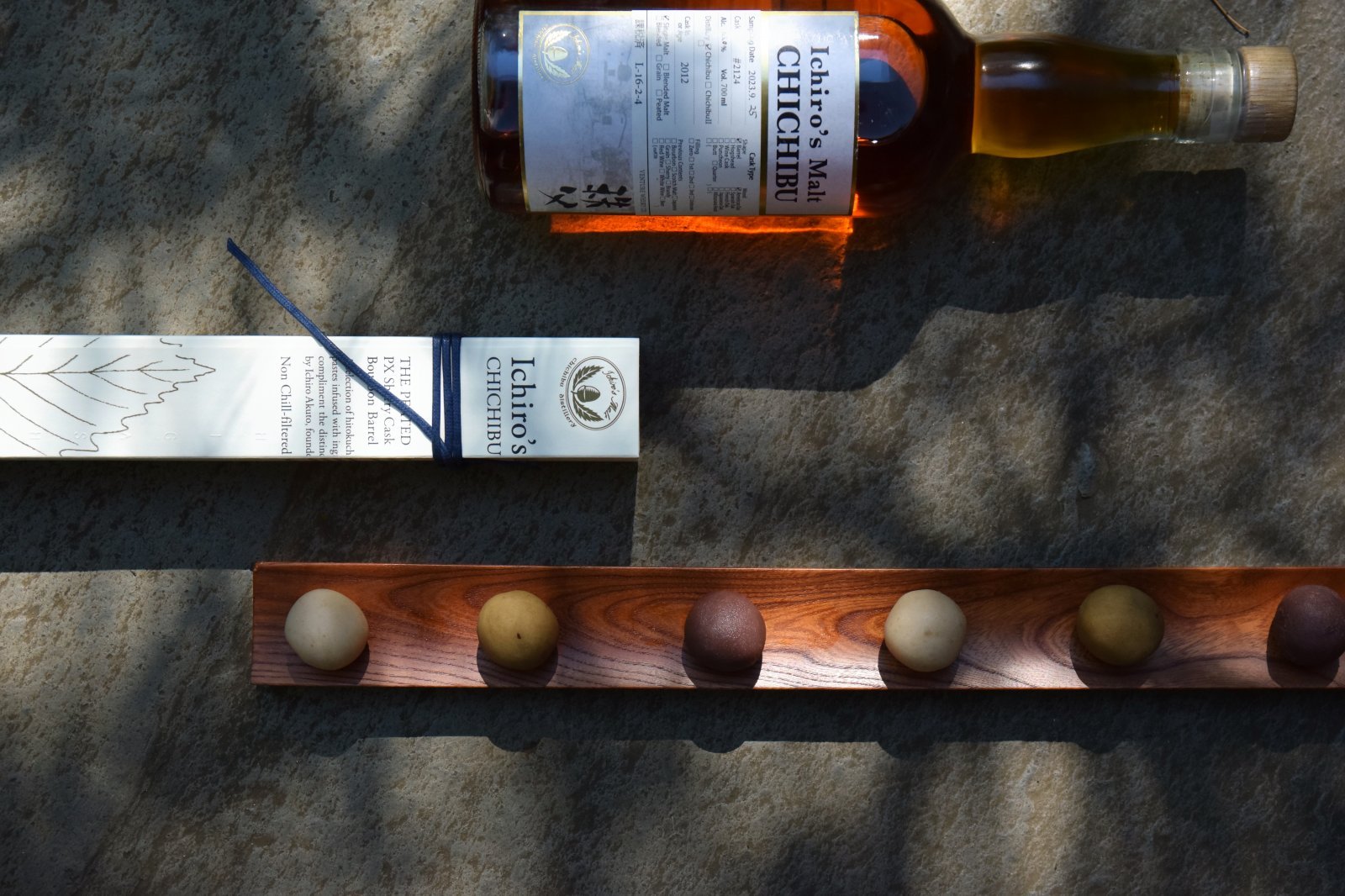 第2弾として、11月の立冬から12月6日まで限定で販売中なのは、ジャパニーズウイスキーブームを牽引するイチローズモルトとのコラボアイテム「ひと口果子 時の恵み」。イチローズモルトといえば、世界的権威のあるウイスキーの品評会、ワールド・ウイスキー・アワードで、2017年から6年連続でブレンデッドウイスキー・リミテッドリリース部門の世界最高賞を受賞。いま世界で最も入手が困難なウイスキーを生産する蒸留所のひとつだ。