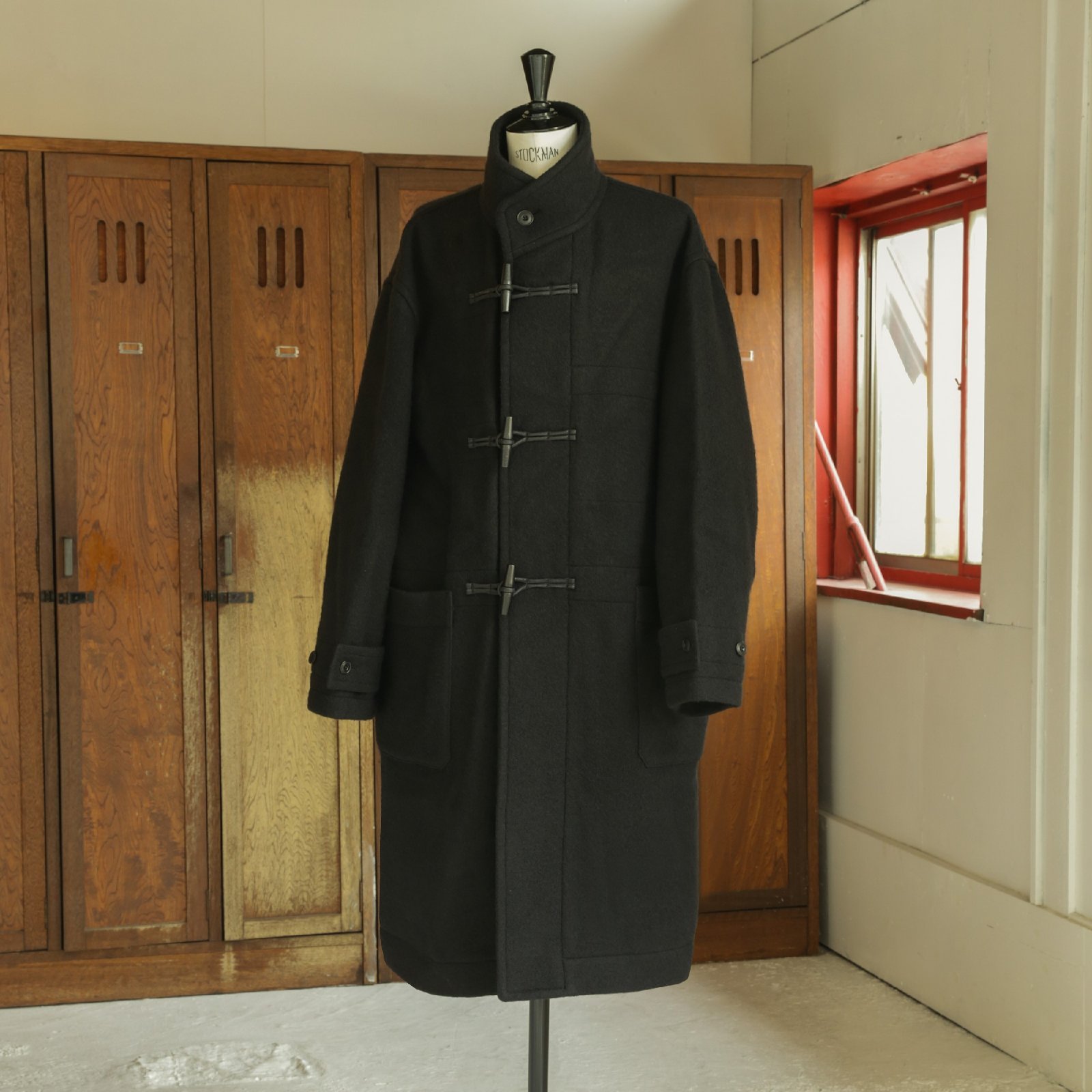 ボタン付きのスタンドカラーでフードレス、さらに膝下丈のスッキリとした縦長シルエットに仕上げたダッフルコート。やや起毛感のある厚手のヴァージンウール生地や木製トグル、コードループなどすべてが黒で統一されたデザインもシック。