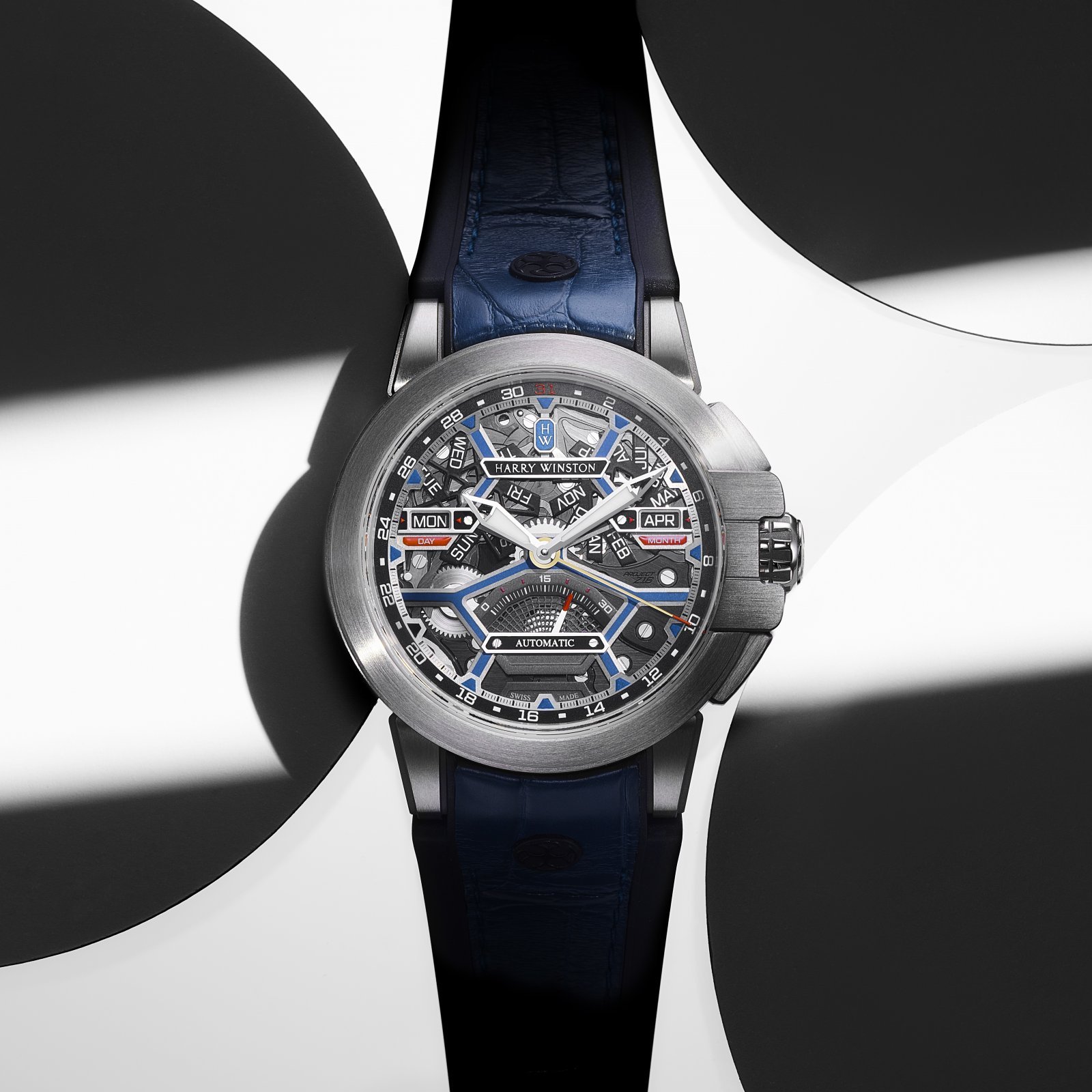 特殊合金のザリウムを用いた「プロジェクト Z」シリーズの第16作目。センターから伸びるポインターデイトに加え、シンメトリーに配した曜日と月のカレンダー機構をオープンワークの3Dダイヤルで透かした、シリーズ初のトリプルカレンダー機構を搭載。秒針は30秒のレトログラードで魅せる。