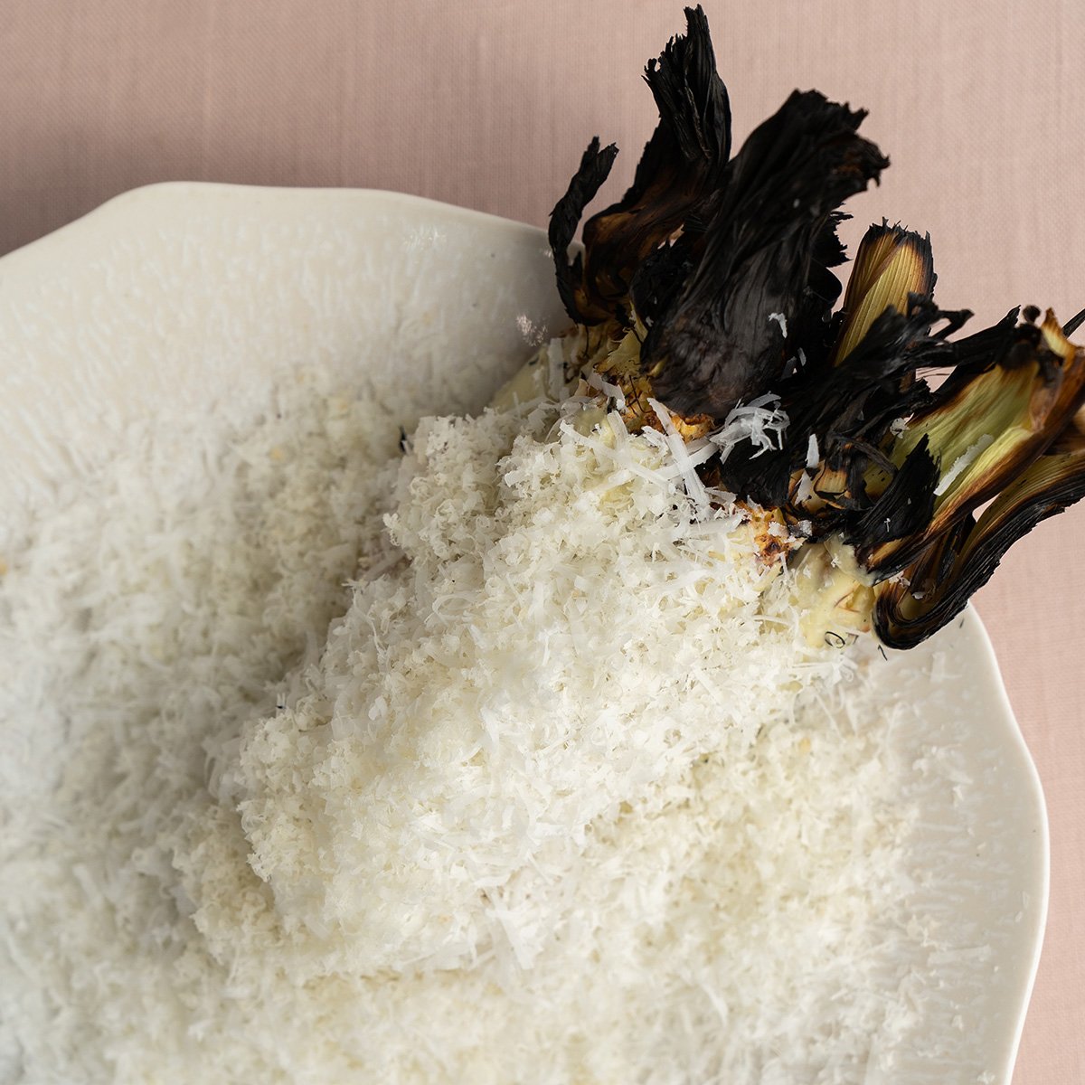 グリーンアスパラをスライスし、レモンゼリーやアスパラのメレンゲとともに花に見立てた一皿。 下右:ヨーグルトに、炭酸ガスを封じた飴を合わせた。口の中ではじけるパチパチとした食感には、誰しも驚くはず。器は有田焼を使用。