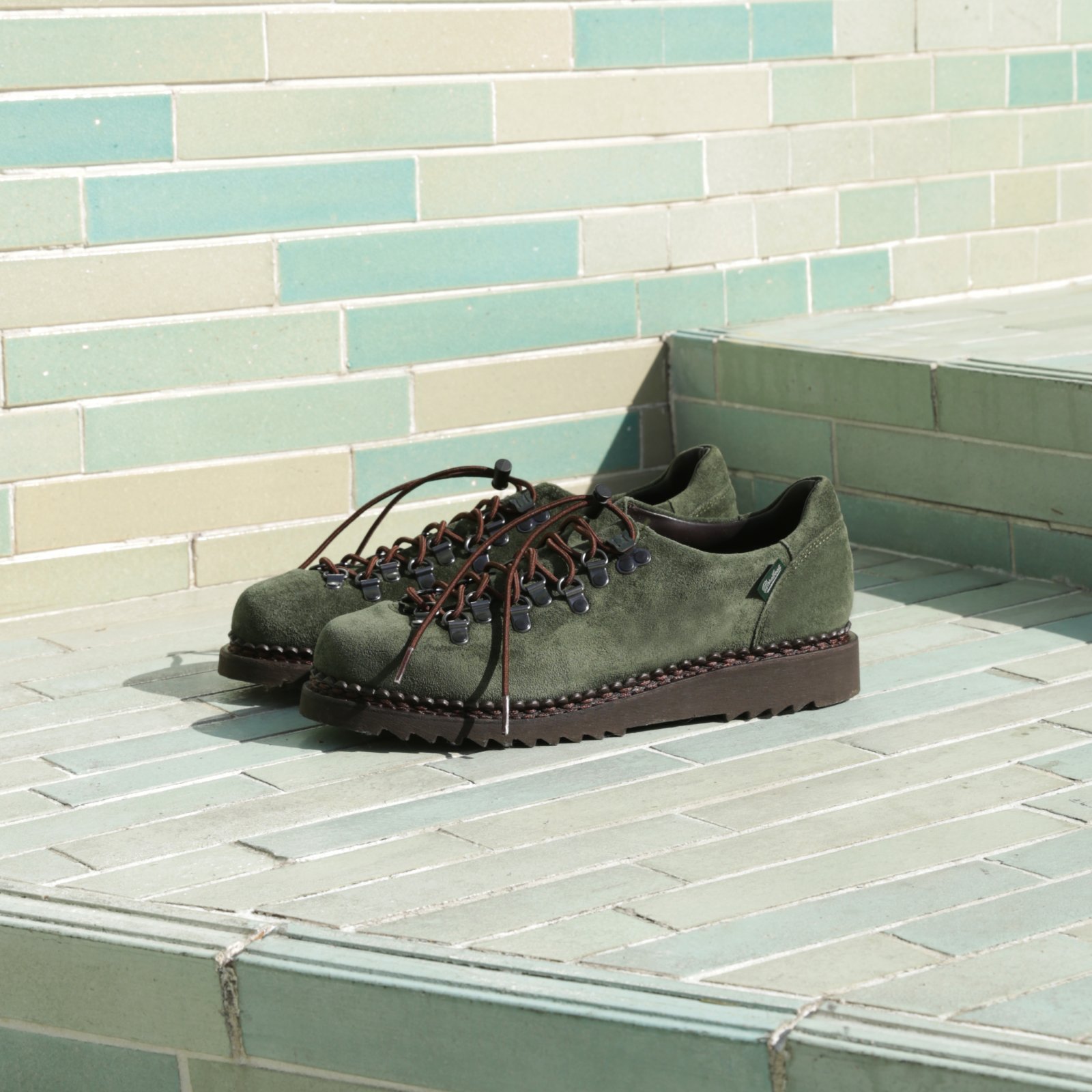 ジグザグに配されたD環や天然ゴムの軽量ソールが特徴的。ショート丈のスエード素材なのでスニーカー感覚で履けるが、手縫いのノルウィージャン・ウェルテッド製法を採用。つくりは堅牢性と防水性の高さを誇る。