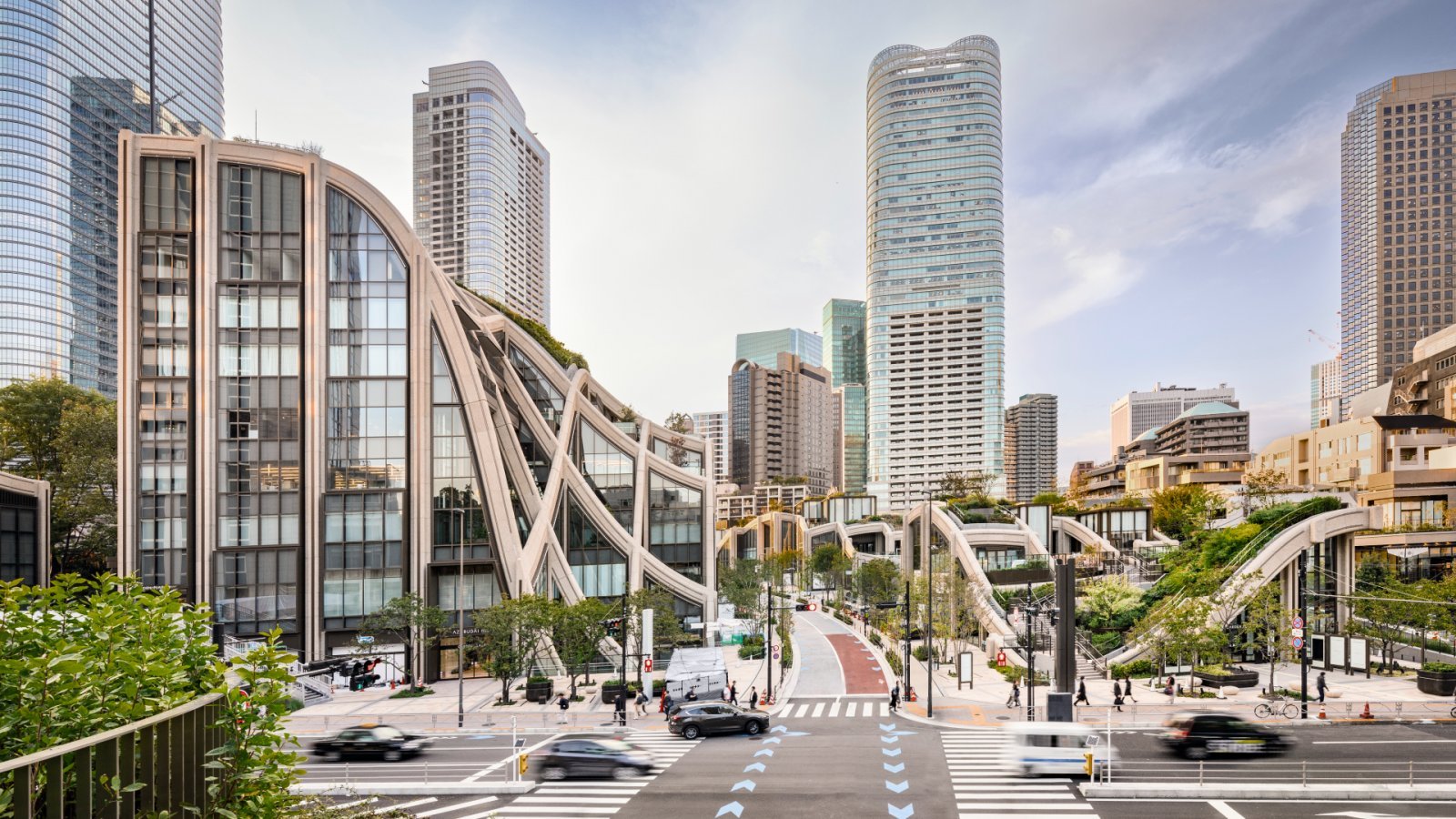 東京らしさのある新たな都市の居場所として、網目状のガラスウォールが波打つ有機的な建築を提案。それらを取り巻く曲がりくねった散策路や屋上斜面が日本の四季を意識した多種多様な植栽で彩られ、プロジェクトのコンセプトを体現している。