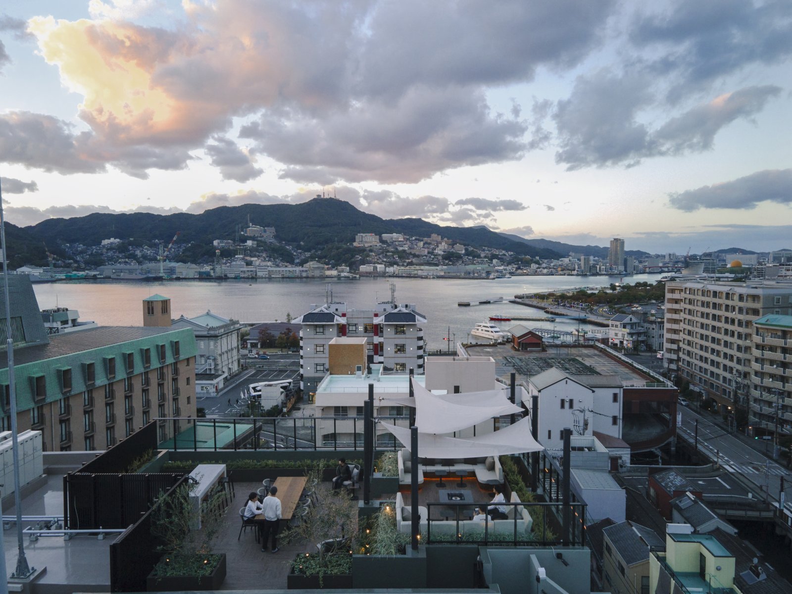 宿泊者限定で利用できるのが、長崎湾が一望できるルーフトップ。日中ののどかな長崎市街の風景はもちろん、夕暮れや夜景まで、時間ごとに長崎のさまざまな表情を眺められる。観光やレジャーを楽しんだ後、長崎の夜景を横目に、仲間たちとのたわいない会話とともに締めくくる1日は、格別だ。
