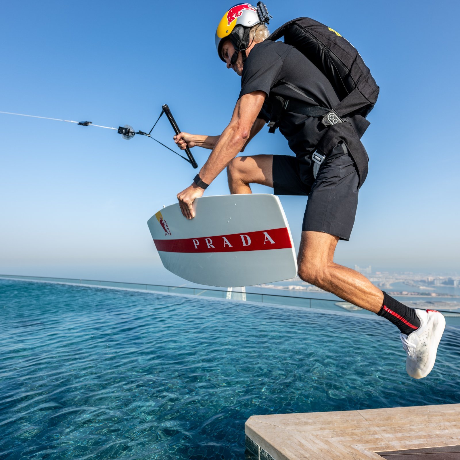 294mという驚異的な高さにあるドバイのインフィニティプールを舞台に、ウェイクスケートのパイオニア、ブライアン・グラブによる圧巻のパフォーマンスが実現した。時速30㎞のドローンに牽引されながらプールを横切るウェイクスケートから始まり、さらにプールの縁を飛び越え、294mもの高さから地上のビーチに着地するというスリリングなチャレンジだ。ドローンとアスリートの高度な技術が見事に融合した大迫力のパフォーマンスは、プラダのYouTubeで視聴可能だ。