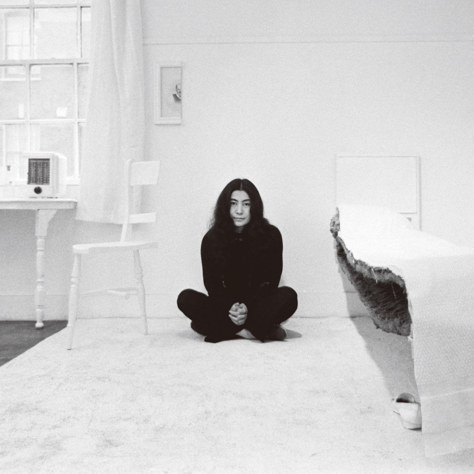 1967年、ロンドンで開催された『HALF-AWIND SHOW』にて展示された作品『Half-ARoom』とオノ・ヨーコ。すべての家具が半分に切断されている。 Yoko Ono with Half-A-Room 1967 from HALF-A-WIND SHOW, Lisson Gallery, London, 1967. Photo © Clay Perry