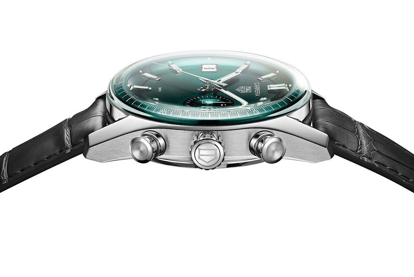 今回のカレラコレクションのテーマカラーであるティールグリーンは、モータースポーツの歴史への敬意の表れ。1920年代から60年代にかけては、国ごとにレーシングカーの塗装色が分けられていた。ティールグリーンは、当時使われていたヴィンテージグリーンを再現したものだ。