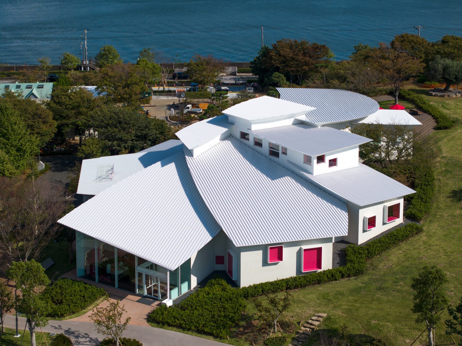 なだらかな丘の中腹に佇む純白の建物は、桜やツツジ、ケヤキなど、四季折々に変化する園内の樹木に寄り添うように、小さな箱を並べた外観が特徴的。「フラワールーフ」と名付けられた軽やかな屋根がかけられ、建築そのものが花びらを連想させる。
