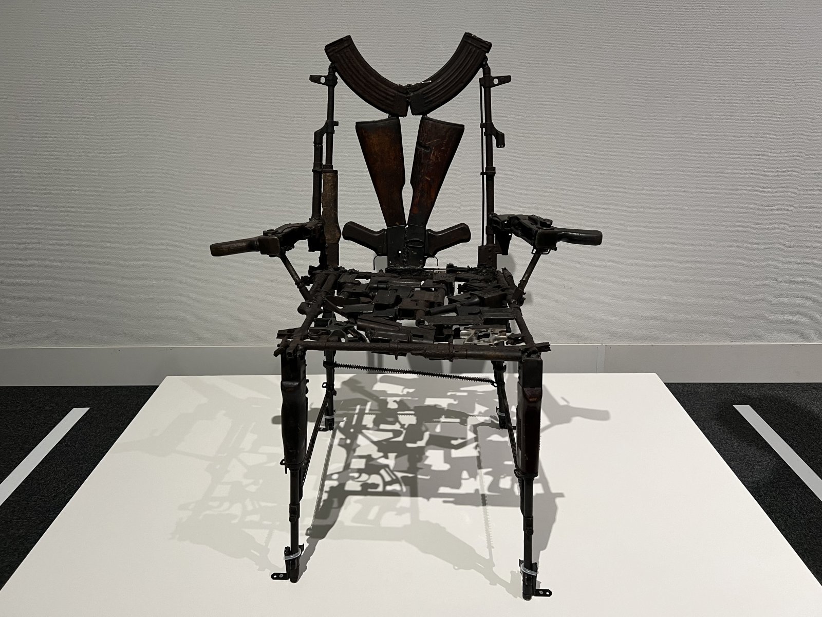 マルセル・デュシャンの『自転車の車輪』やジム・ランビーの『トレイン イン ヴェイン』は、既製の椅子を素材に取り込みつつも、座ることは叶わない作品だ。いずれも椅子という形を借りながらも、独自の手法で機能を変容させ、コンセプチャルな問いを発している。一方でアンディ・ウォーホルの連作「電気椅子」や、内戦終結後に大量に残された武器を用いたリストヴァオ・カニャヴァート(ケスター)の『肘掛け椅子』などからは、死や暴力、権力に対して椅子がどのように表現されていたのかを見ることができる。このほか、家具や日用品を糸で再現するYU SORAのミシンによるドローイング『my room』や、ナフタリンで象られた椅子が樹脂に封入された宮永愛子のオブジェなど、日々の生活の延長上にある椅子の記憶や物語を呼び起こす作品も見どころといえる。