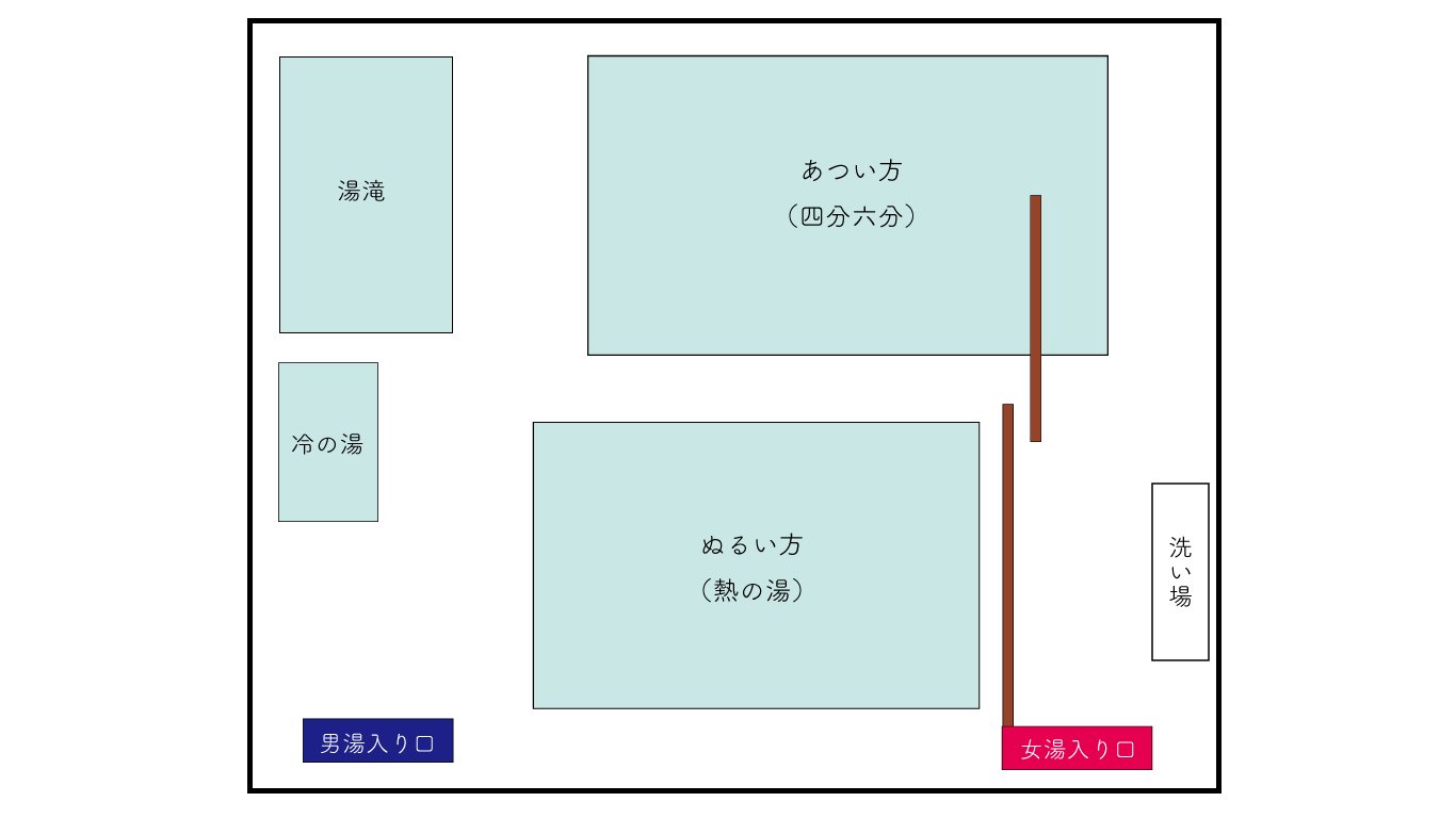 心配だった混浴ですが、中の写真は撮れないのでイラスト描いてみました。こんな感じになっています。(ちなみに公式サイトには浴場のお写真もあるので、こちらでチェックしてみてください)
