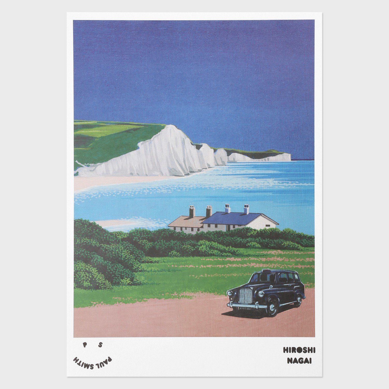 今回のコラボでモチーフとなったのは、ポール・スミスの故郷であるイギリスの大自然が織りなす絶景で、これまでアメリカやハワイ、グアムといった南国の景⾊を中心に描いてきた永井にとって初挑戦となった景色。まだ一度も訪れたことがない風景に思いを馳せながら、イギリスの絶景として人気の観光名所「セブン・シスターズ」を題材に描いたという。空の色や風景に映る車など、南国を描いたこれまでの作品との細かな違いも楽しめる作品になっている。