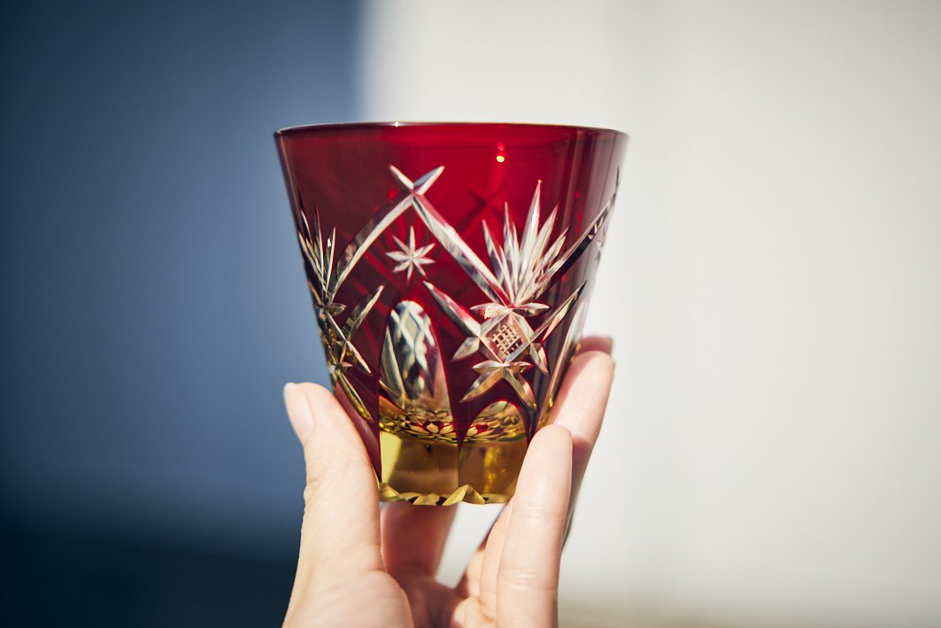 強く濃い色でありながらも透明感にあふれた赤や青、そして、淡く優しい黄色や水色。細かい吉祥文様や花柄が施された切子のグラスの、彩り鮮やかな光に目を奪われていた。
