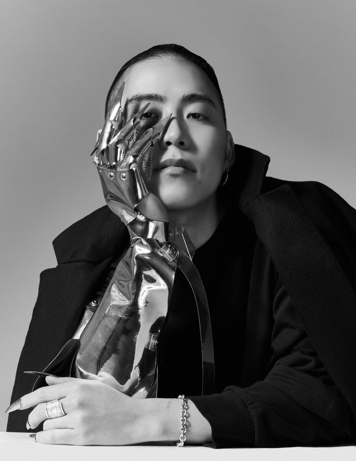 アンドロイドコレクションを制作したのはコロナになってからで、そのきっかけがこれです。自宅待機の期間にビヨンセのPVを見ていて、やっぱりかっこいいなと思って。一緒に仕事ができたらいいなと思っていたところ、ビヨンセのスタイリスト、ゼリナ・エイカーズのチームからDMがあったのです。ティエリー・ミュグレーのようなロボティックルックをつくってほしいと依頼され、すぐに取り掛かりました。そこからゼリナのクライアントの服をいくつかつくり、最終的にビヨンセが着てくれることになったのです。コロナ禍で皆が思うようなクリエイションができない中、ビヨンセの近未来的なMVは話題になり、僕に対しても注目が集まりました。人生の中でも大きな波が訪れた瞬間でした。