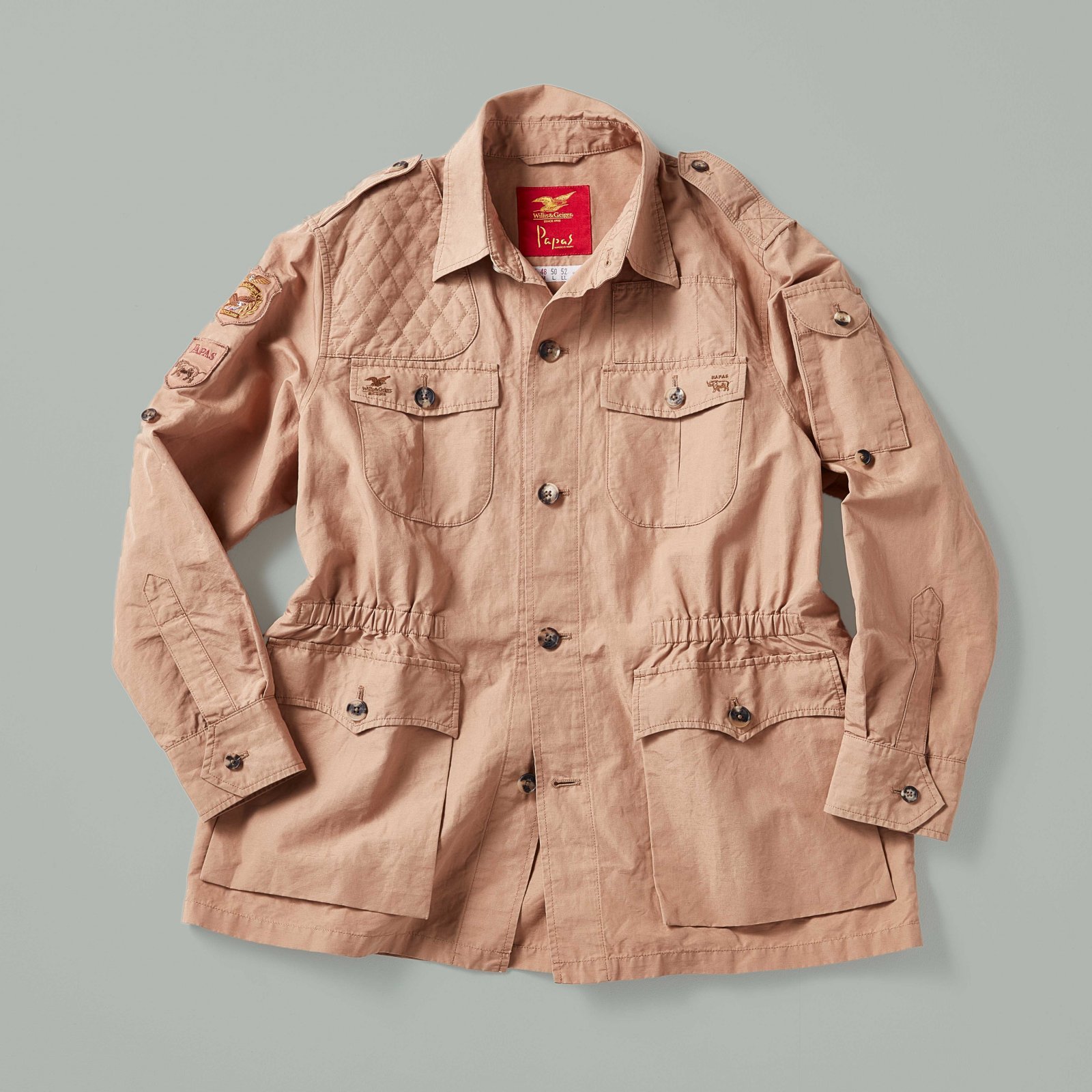 作中の彼のスタイルを彷彿とさせるサファリジャケットがある。日本のパパスというブランドが今シーズン、アメリカのウィリス&ガイガーと組んで製作したジャケットだ。ウィリス&ガイガーはノーベル賞作家のアーネスト・ヘミングウェイが愛用したことで知られる1902年創業の老舗。さらにヘミングウェイはパパスというブランド名の由来であり、ヘミングウェイが着て似合う服を創造してパパスのコレクションは毎回デザインされている。