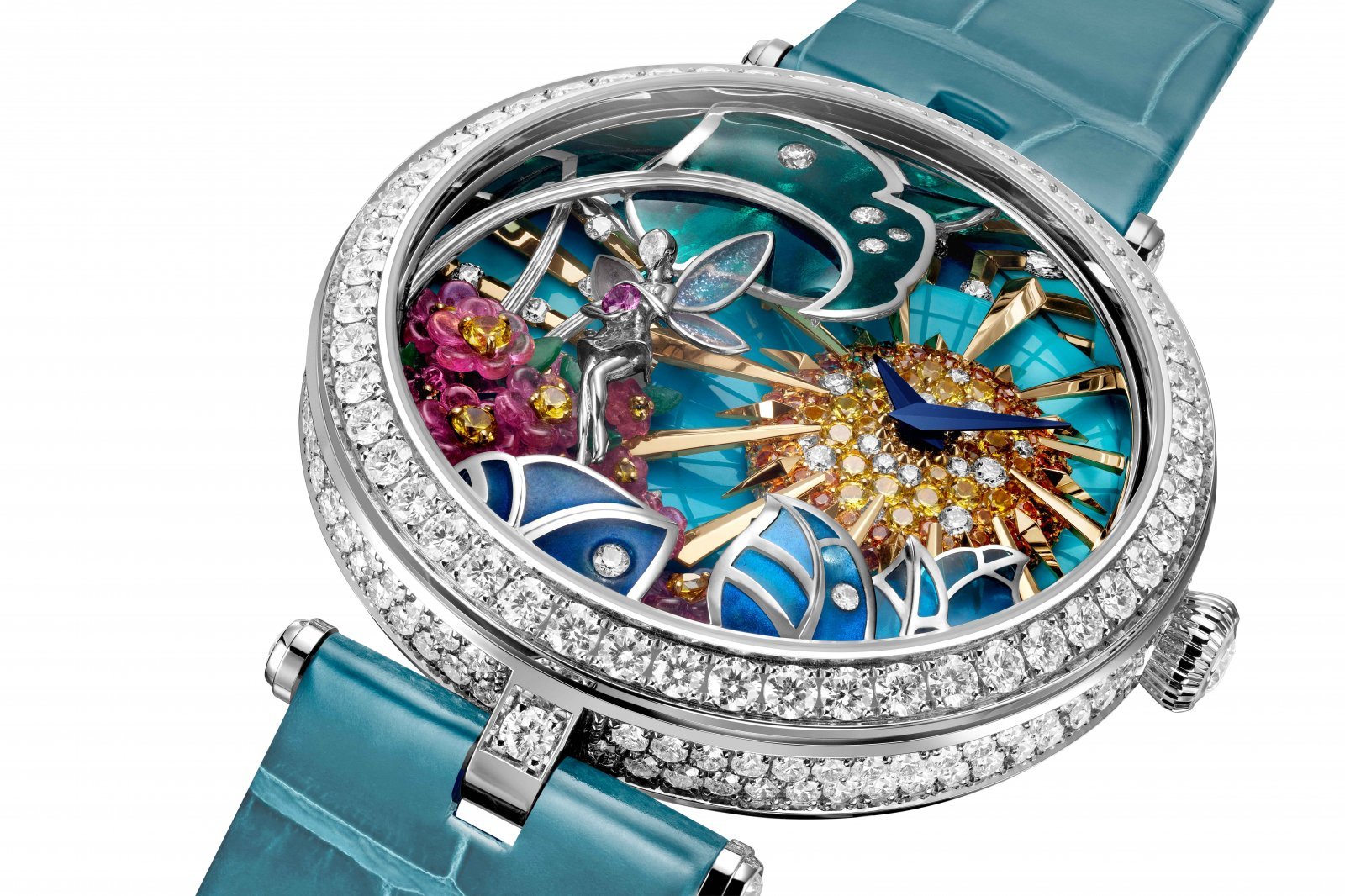 そして多彩なモチーフで構成する文字盤のベースは、3色のターコイズのストーンマルケトリーで仕上げ、奥行きと立体感を演出している。それはまさにメティエダールが生み出した華麗なる舞台なのである。