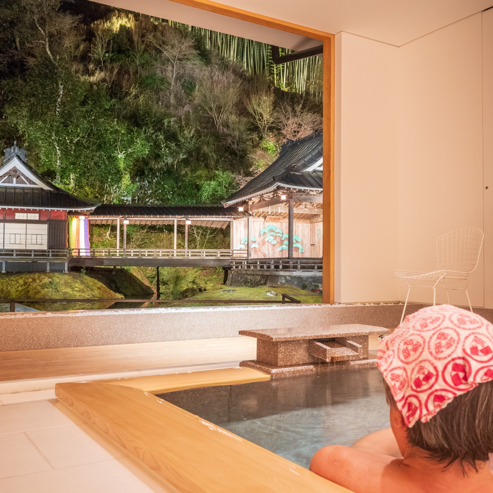 あさばは、五感で味わう宿である。それは重厚な門をくぐり、玉砂利を踏む音から始まる。風にゆれる暖簾をかき分ける手の感触。中庭の大池に流れ落ちる滝の音。靴を脱いだ後、足裏で感じるカーペットの厚み(スリッパなどという無粋なものはない)。部屋に入るとそれが畳の安らぎに変わり、美しい空間が目に飛び込んでくる。風呂場は檜の香りに包まれている。浴槽に好みの温度で湯を張り、窓を全開にすると目の前に水上の能舞台が現れる。日程さえ合えば、能や狂言を風呂に浸かりながら鑑賞することもできる。この温泉でまどろむ時間は、主人の思いが行き届いた美を全身で反芻する行為に等しいのである。