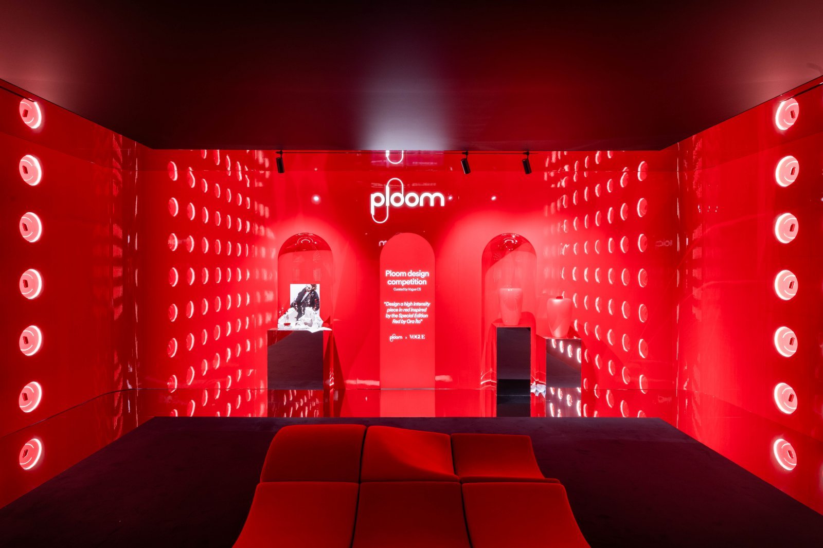 会場はデバイスの世界観を伝える赤色をテーマに、複数の部屋で構成されている。1つ目の部屋は、プルーム・エックスのデバイスのような、光沢感あるシームレスな曲線を描く壁で区切られ、赤色の照明で照らされた空間。ラグジュアリーさとポップさを兼ね備えた異世界を生み出していた。