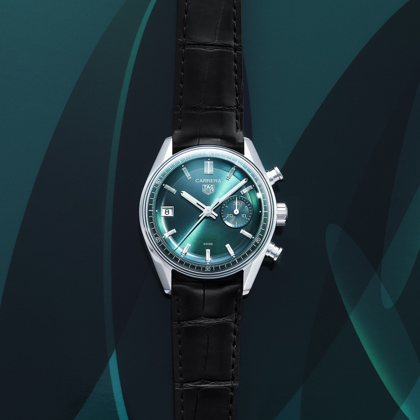 モノサブダイヤルの人気を牽引する1本。昨年発表したグラスボックス形の「カレラ」のスタイルに、3時位置に30分積算計をサブ装備するクロノグラフに仕上げた。ケースエンドぎりぎりまでのドーム形サファイア風防、サーキュラーサテン仕上げのティールグリーンダイヤル、ピストン型プッシュピースなど、全体にヴィンテージ感も漂う。