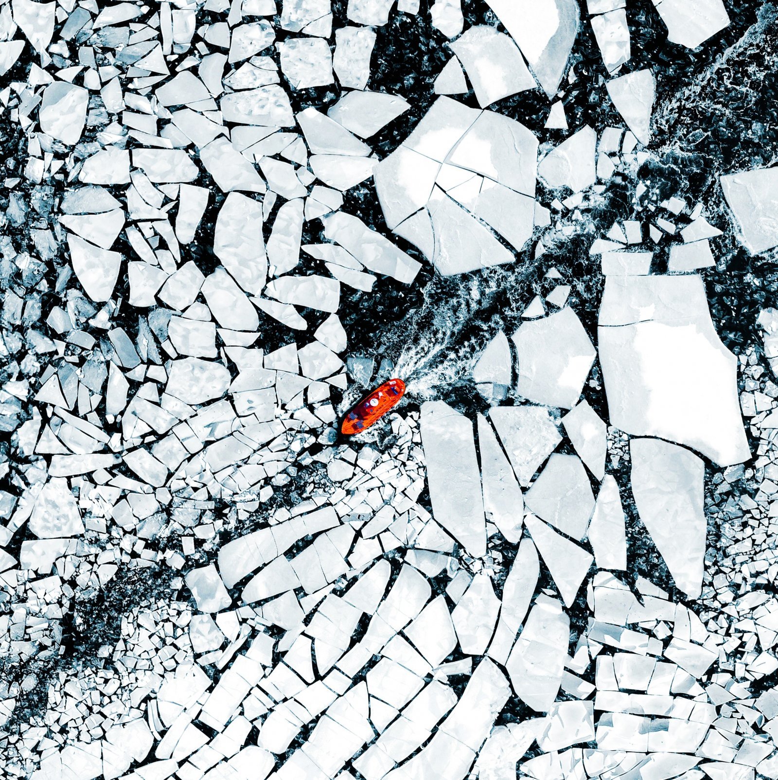 なんと、これらの作品はそのどれもが1枚の写真ではなく、実際は何千枚もの画像を組み合わせてつくられているのだという。たとえば、流氷が浮かぶ海と、そこを進む赤い船を描いたビジュアル。この作品においては、流氷1枚1枚がすべて独立したパーツになっているのだ。