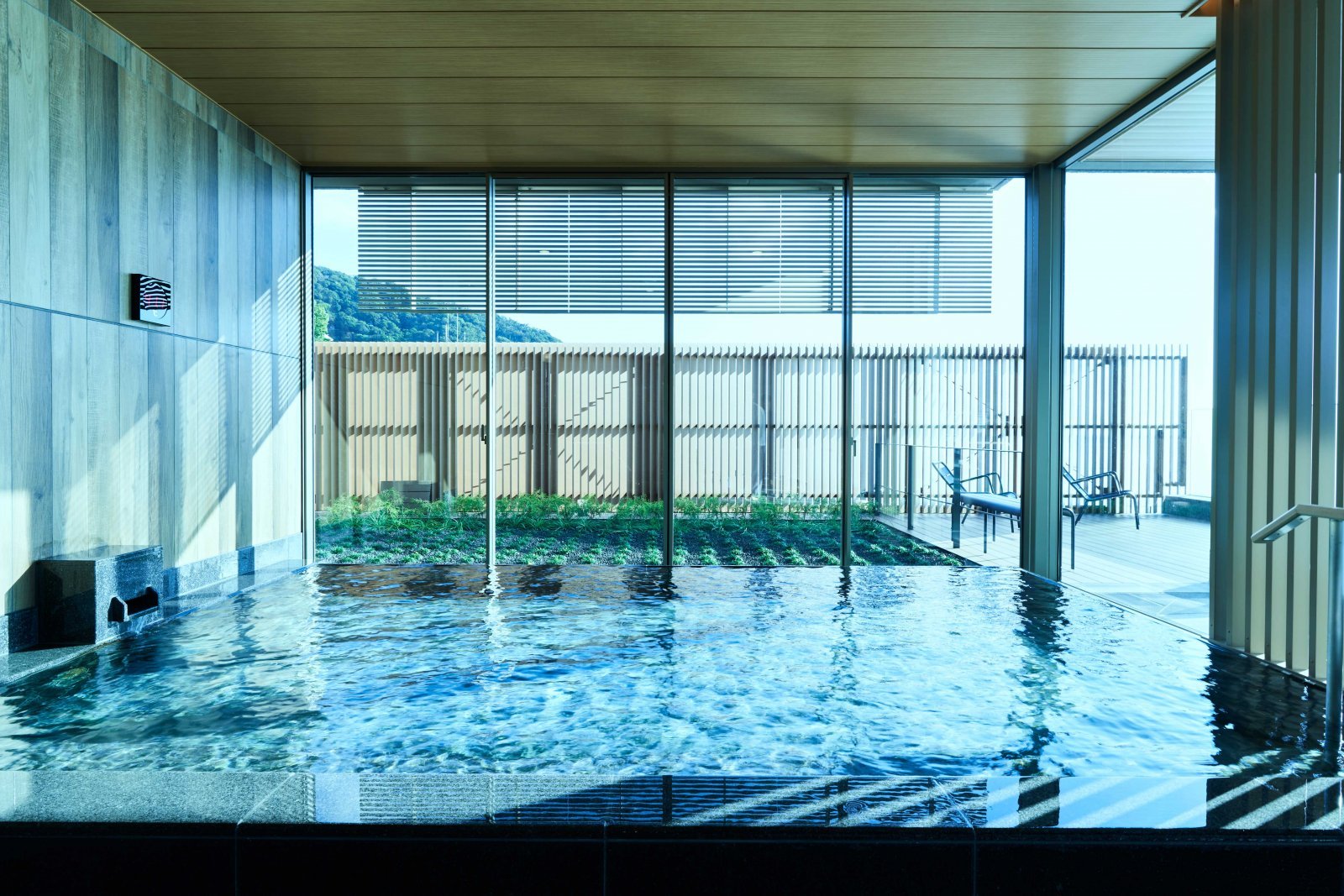 ラウンジにはテラスも併設され、そこにはまるで海と一体となるかのような水盤が広がり、心地よい潮風に包まれる。ここではぜひ、この眺望に酔いしれながら足湯に浸かりたい。都会の喧騒を忘れ、心身を非日常へと誘うスイッチになるはずだから。
