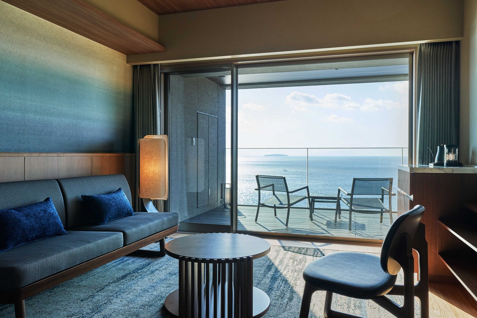 今回滞在したのは全10室ある「佳ら久ルーム」。室内は深い海のようなブルーを基調とした設えで、相模湾に映るムーンロードをイメージしたアートが壁面を飾る。テラスには眼前に広がる相模湾の美しい眺望を遮ることのないよう、ガラスフェンスを採り入れている。まるで海の景観と客室がひと続きになっているかのような錯覚を覚える。