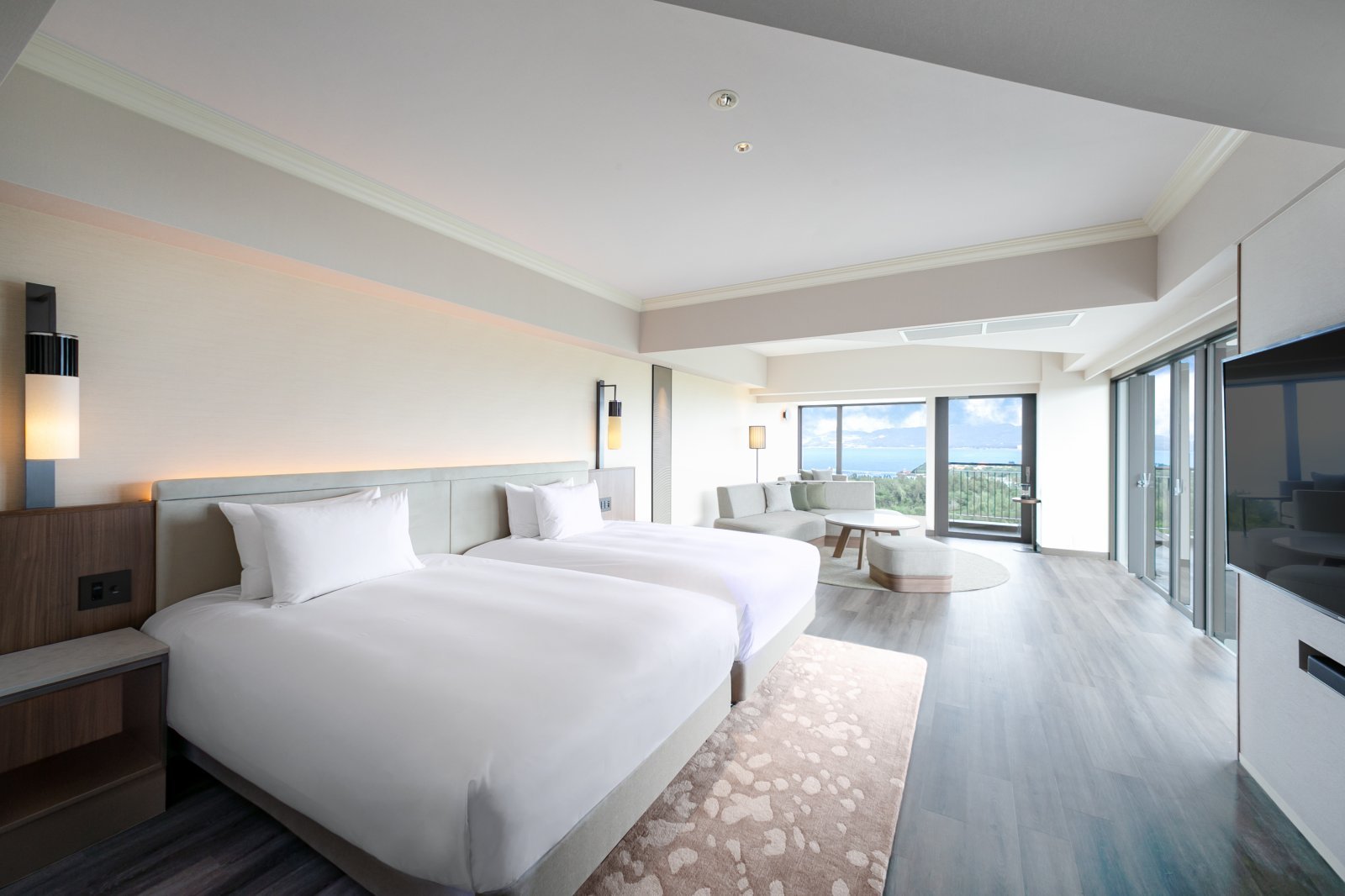 リニューアルした全361室のゲストルームは、そのすべてがプライベートバルコニーから東シナ海を見下ろすオーシャンビュー。さらにデイベッドとテーブルを備えたインナーテラスが設けられているので、遥か遠くまで広がる紺碧の海とやんばるの深い森が織りなす奇跡の絶景に没入できる。いずれも白やベージュを基調としたモダンな内装で、大きな窓に映る自然の美しい風景が、落ち着いた客室に華を添えているかのよう。