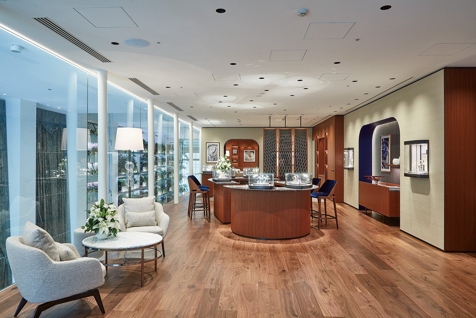 すべてのスペースデザインと調度品は、スイス本社のデザインチームが選び抜いたものだ。ヴェネツィアの老舗「バロヴィエール&トーゾ」製の照明スタンドはじめ、各国から銘品が運ばれた。そのステータス感にブレゲのエスプリが添えられ、華やかさのなかにもリラックスを誘う。大理石カウンターのベース部分には「クラシック」コレクションのコインエッジを想わせるフルート状の装飾が施された。カーペットにはギョーシェ装飾にイメージが重なる曲線のモチーフが。そしてエナメル文字盤でもお馴染みのブランドカラー、深い“ブレゲ ブルー”が壁面やチェアの座面にアクセントを効かしている。さらに店内奥には、よりセキュリティレベルの高いプライベートな来店を意識したVIPラウンジが設定された。