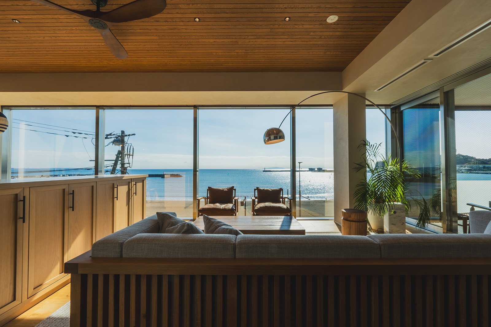 なんと言ってものその魅力は、徒歩30秒で海岸に出られる海近の立地。窓一面に広がるオーシャンビューや夕焼けに染まる江の島を一望できる絶好のロケーションで、都会の喧騒を離れ、波音をBGMにリラックスしたチルアウトタイムを過ごすことができる。