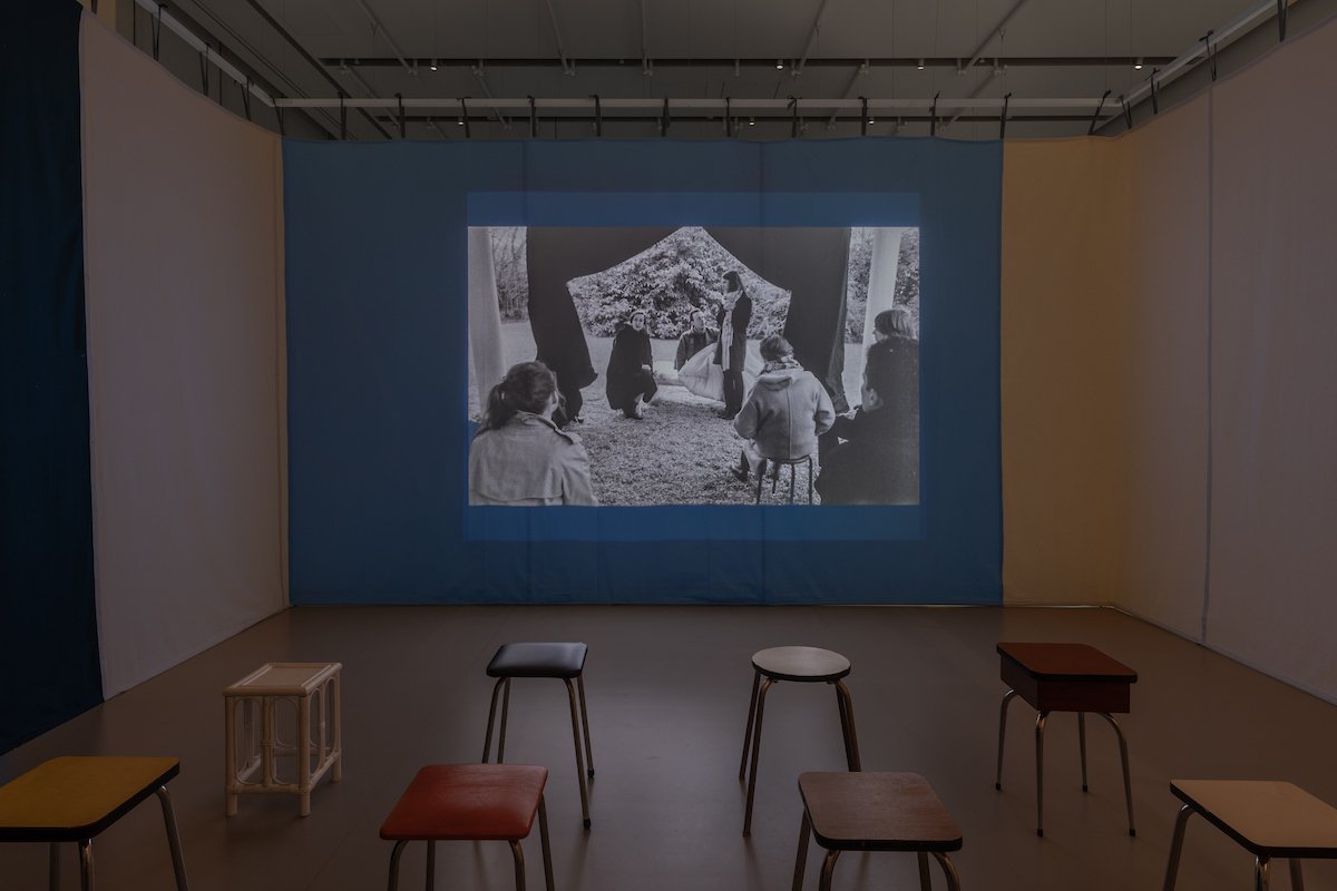 「垂れ幕」はフォン・ブランデンブルクの作品に繰り返し登場する要素だ。劇場から本物の緞帳を借りてきて舞台に取り付けたり、色とりどりのキルトを使用したりとさまざまだ。ドイツのハンブルク美術大学に進学する前に舞台美術を学び、いまなお演劇の世界に強い愛着を持つ彼女が用いる「垂れ幕」は、彫刻と絵画の性質を併せ持つ。そして、展示空間をかたちづくったり区切ったり、時に映像が投影される空間へ導く通路としての役割にもなる。